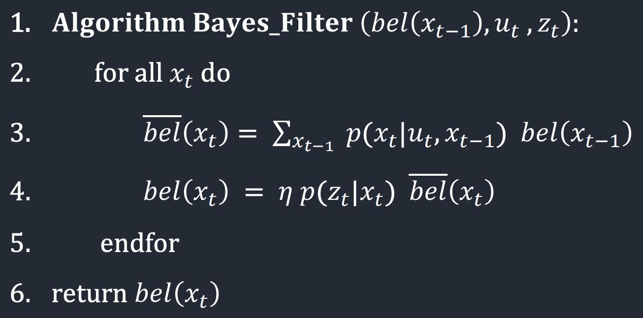 Before starting the lab, I familiarized myself with how the Bayes Filter worked and how to implement the Bayes filter for the robot in simulation. Localization and of the robot determines where the robot is in the enviroment. There is a predition and update step of the Bayes filter. The prediction step uses the control input and accounts for the noise from the actuator to predict the new location of the robot. After the prediction step, the robot rotates 360 degrees gathering distance measurement data. The update step uses the gathered distance measurements to determine the real location of the robot. The Bayes Filter from Lecture 16 is below: