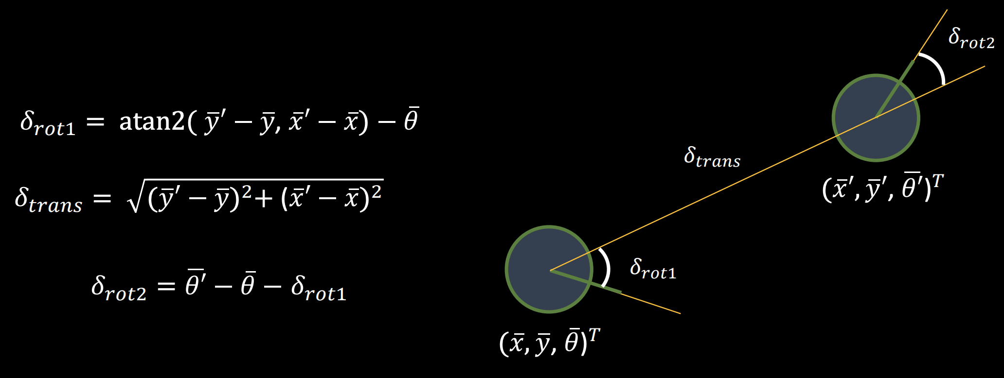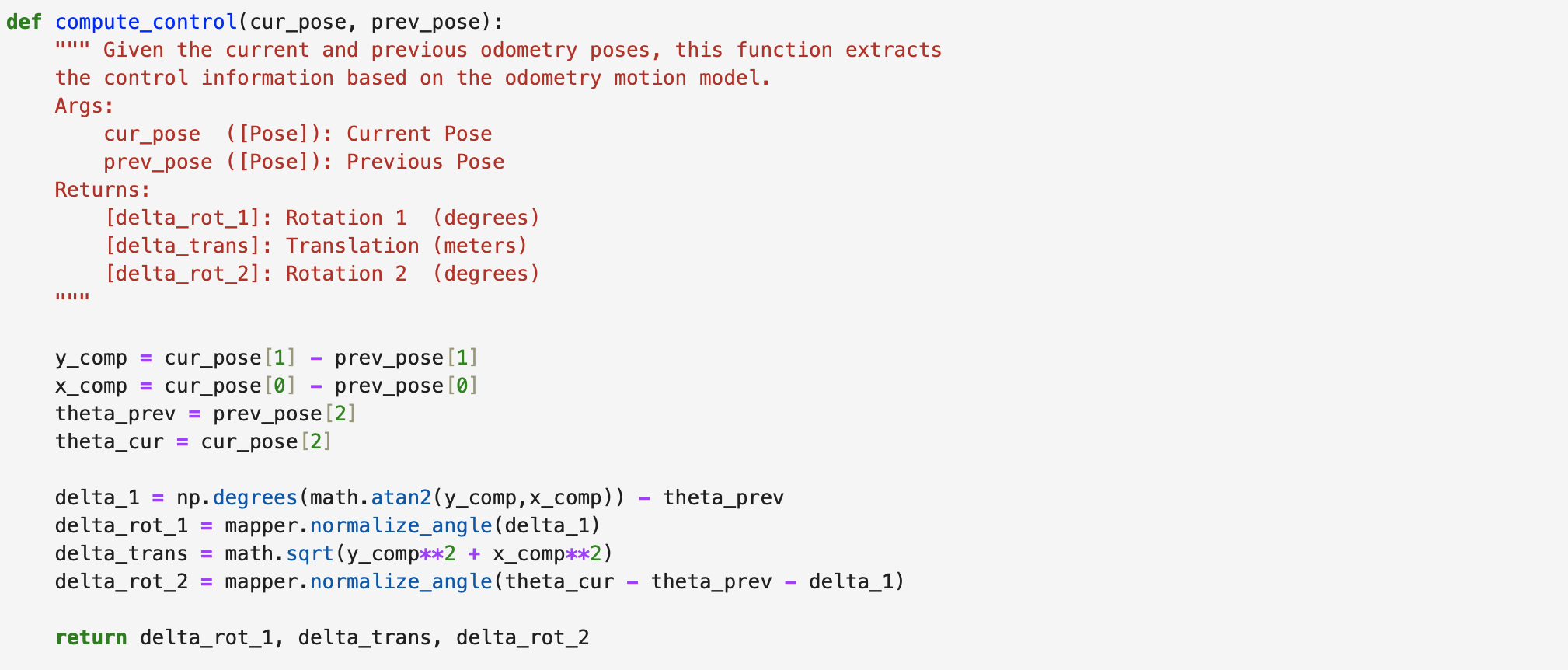 The control information from the robot is used to find the first rotation, translation, and second rotation. The inputs include the current position (cur_pose) and the previous position (prev_pose). The return values include the first rotation (delta_rot_1), the translation (delta_trans), and the second rotation (delta_rot_2). The Lecture 17 slide with the equations to find the odometry model parameters is below: