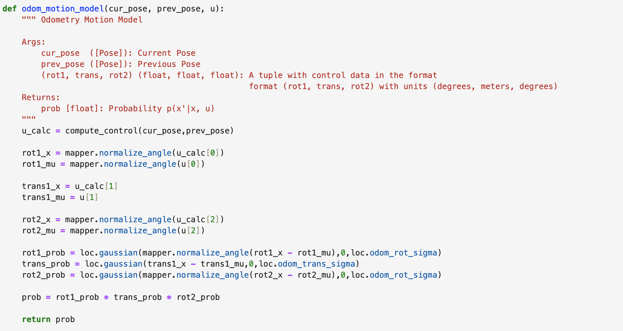 The odometry motion model finds the probability that the robot performed the motion that was calculated in the previous step. The inputs include the current position (cur_pose), previous position (prev_pose), and odometry control values (u) for rotation 1, translation, and rotation 2. The return value is the probablility ( p(x'|x,u) ) that the robot achieved the current position (x'), knowing the previous position (x) and odometry control values (u). A Gaussian distribution is used. Each motion is assumed to be an independent event. The probability of each event is then multiplied together to find the probability of the entire motion. The Jupyter Notebook code is found below.