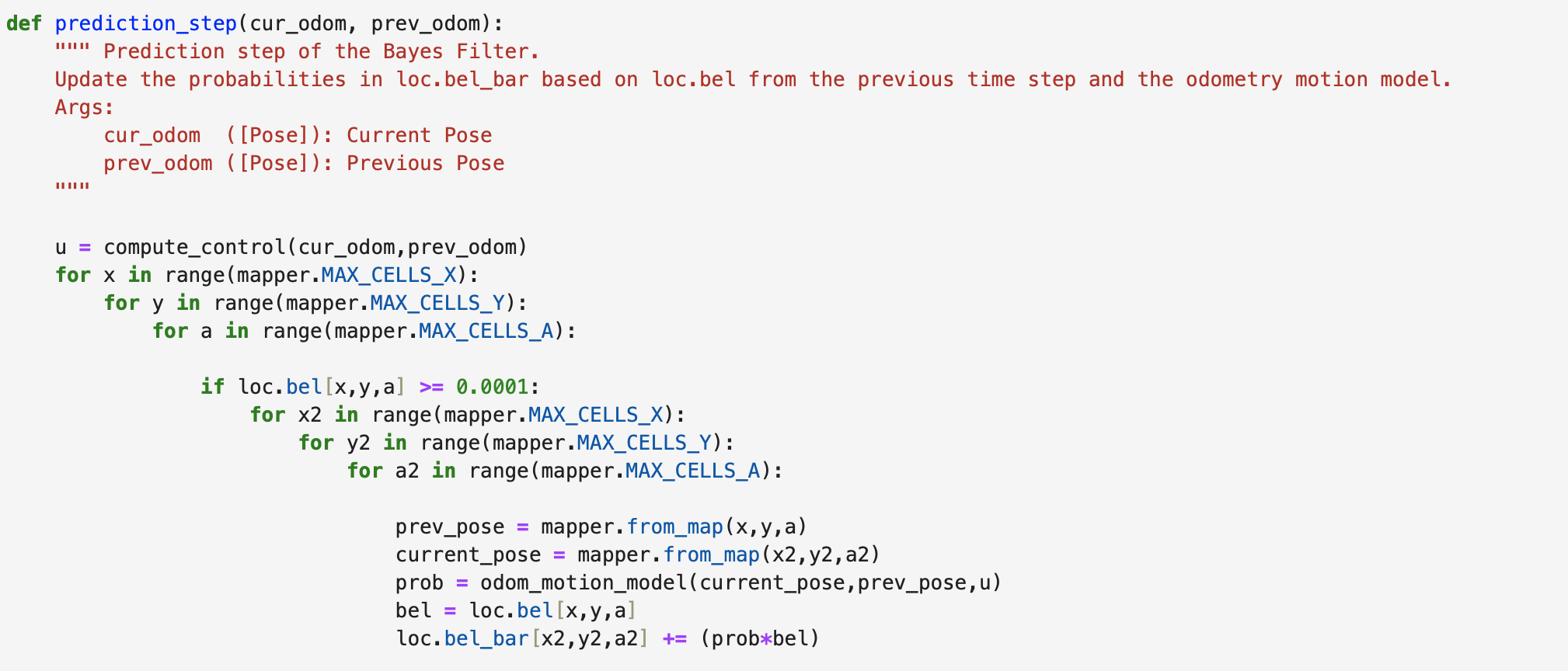 The prediction step of the Bayes Filter as implemented in Jupyter Notebook uses six for loops to calculate the probability that the robot moved to the next grid cell. The inputs include the current odometry position (cur_odom) and the previous odometry position (prev_odom). The if statement in the pediction step code is used to speed up the filter. If the belief is less than 0.0001 than the three remaining for loops will not be entered as the robot is unlikely to be in the remaining grid cells. If the belief is greater than or equal to 0.0001 the probability will be calculated. The code for calculating the probability is below.