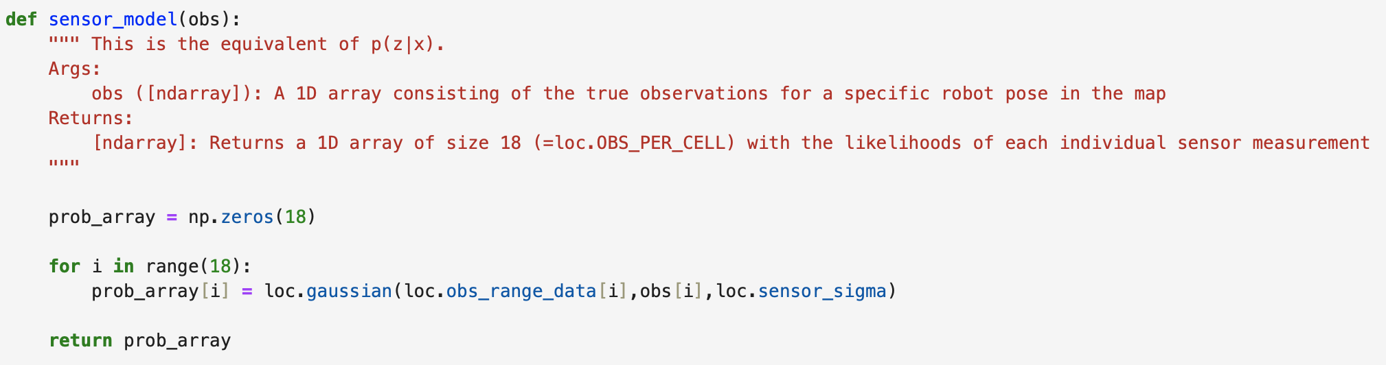 The sensor model function finds the probability of the sensor measurements, modelled as a Gaussian distribution. The length of the array is 18 as the robot measures 18 different distance reading values. The input includes the 1D observation array (obs) for the robot position. The function returns a 1D array of the same length including the likelihood of each event (prob_array). The Jupyter Notebook code is below.