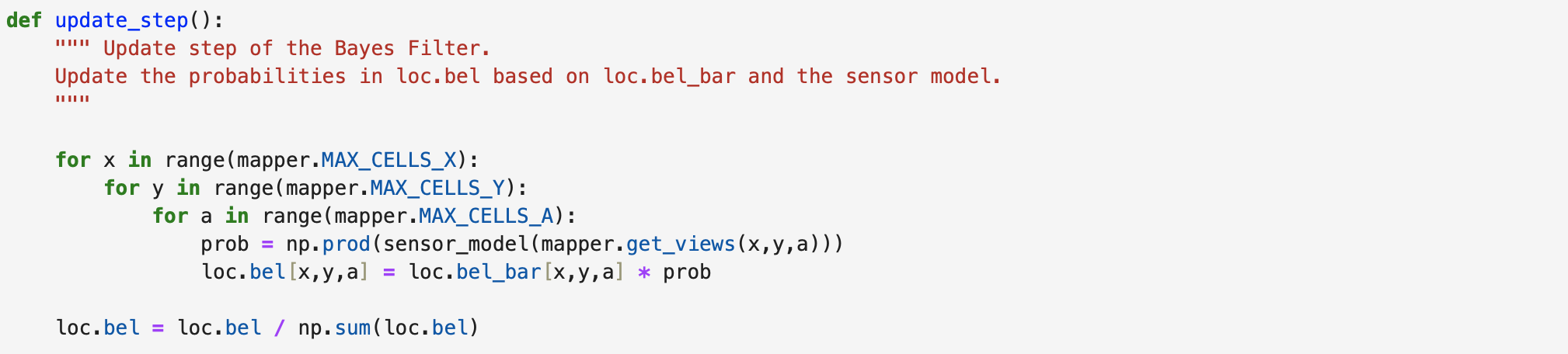 The update step calculates the belief of the robot for each grid cell. The probability ( p(z|x) ) is multiplied by the predicted belief (loc.bel_bar) to find the belief (loc.bel). The belief is then normalized. The code can be found below.