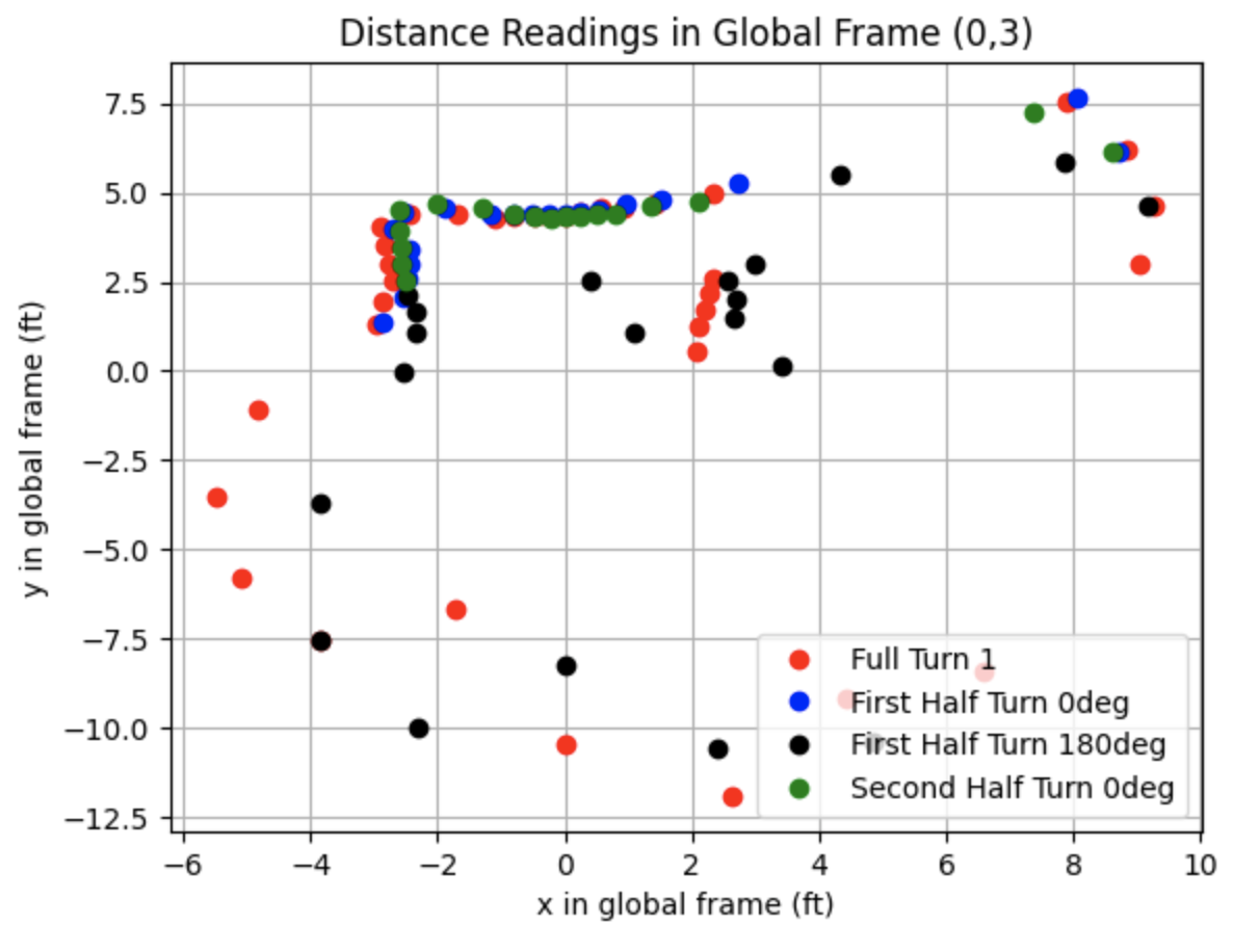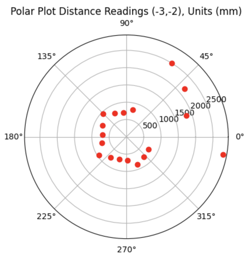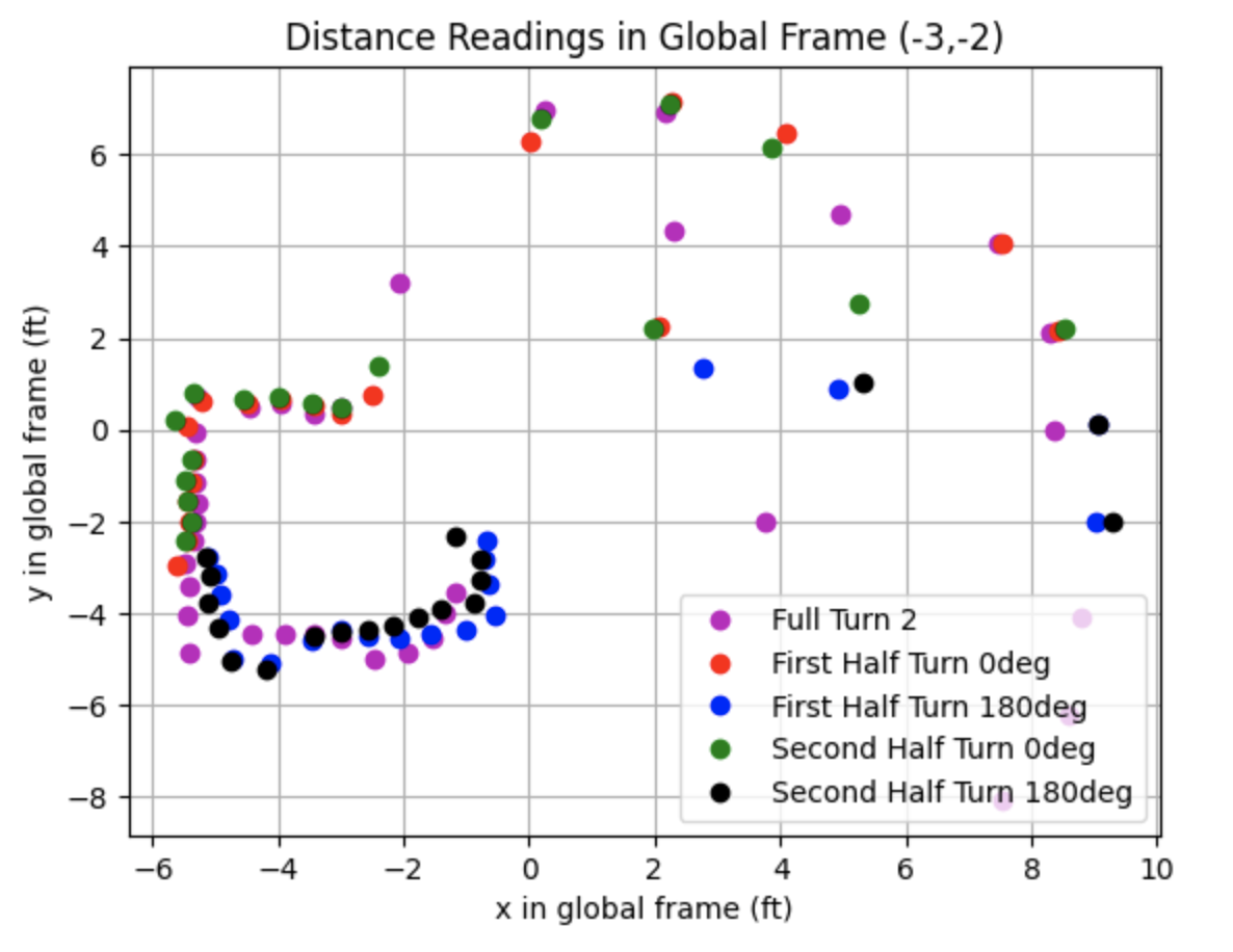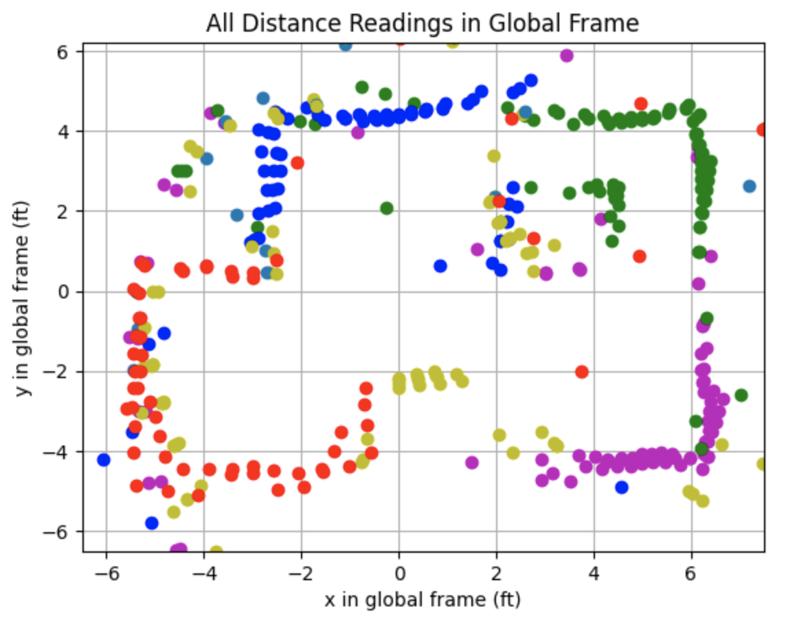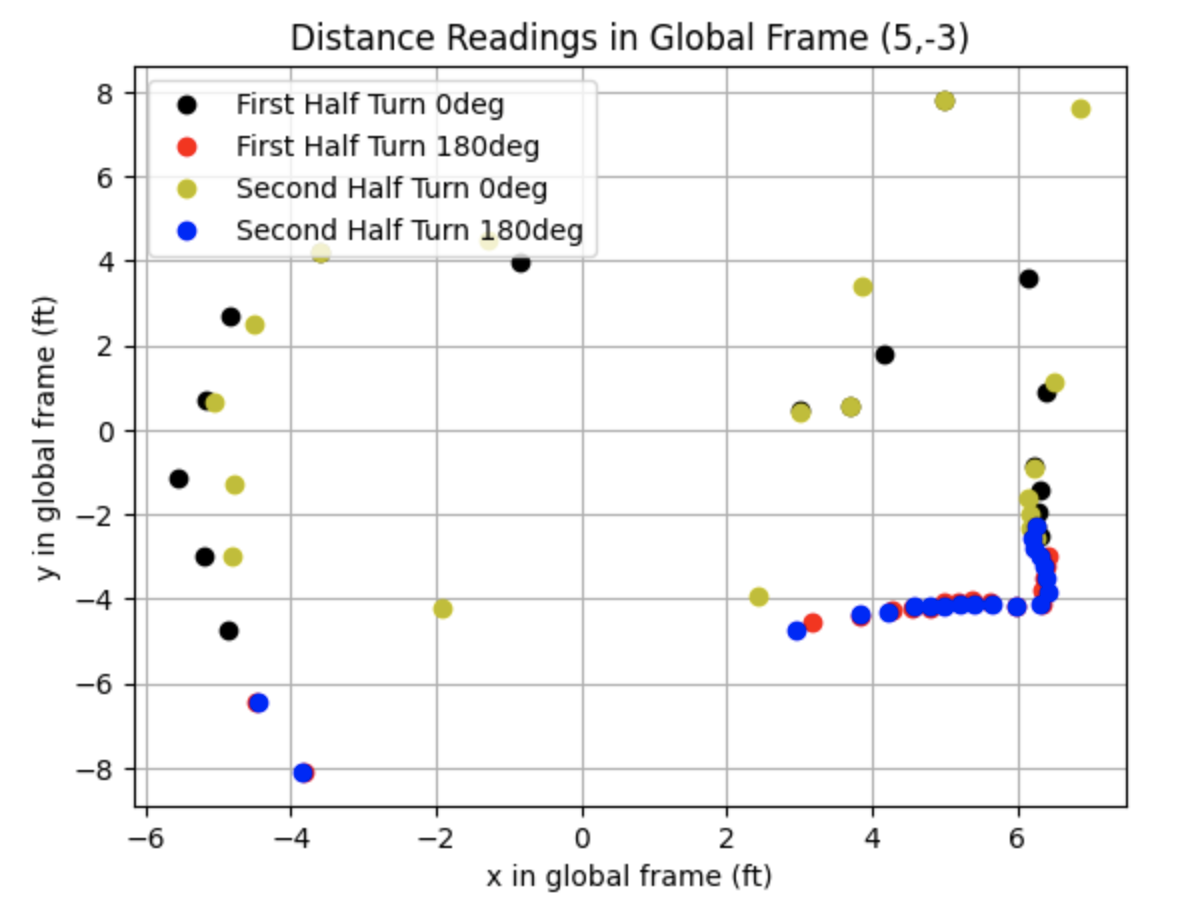 This section details the second attempt at collecting data at each point. The data collected for each point in the lab is plotted in the below graphs. I readjusted the ToF sensor to point more upwards before collecting the following data. This adjustement removed noise from inside the map region. The data collected for each point in the lab is plotted in the below graphs.