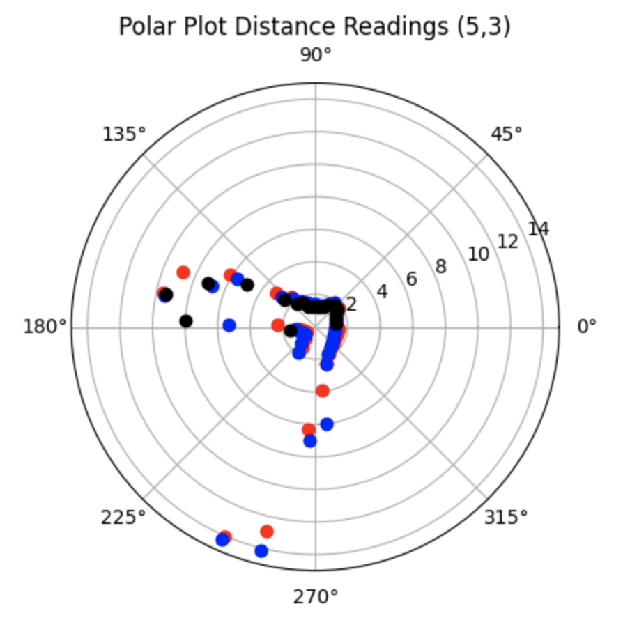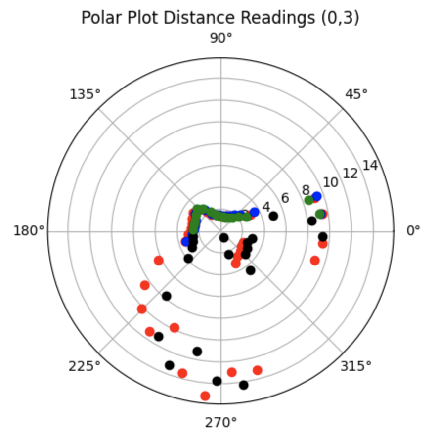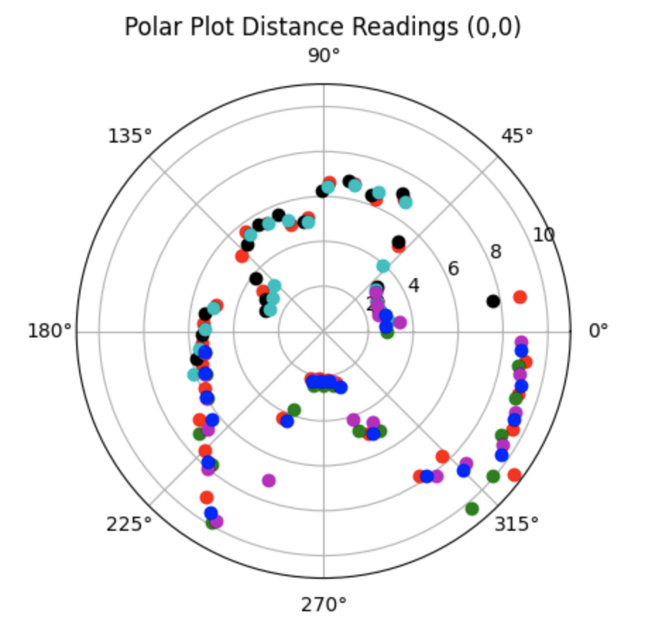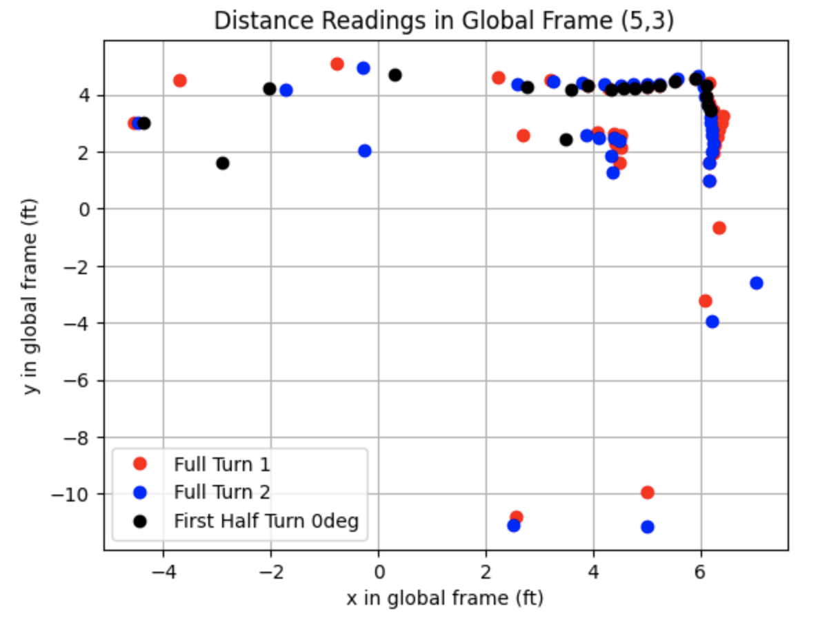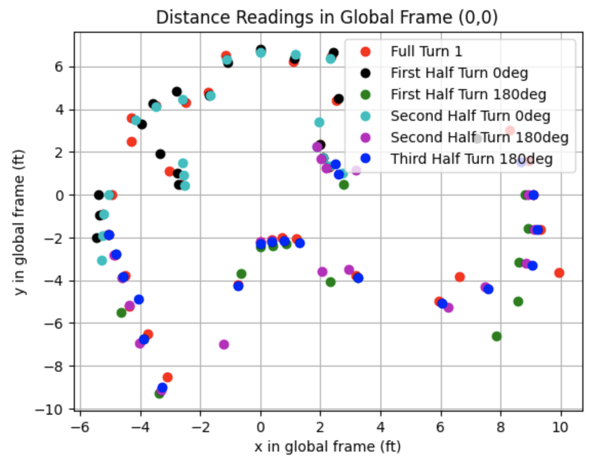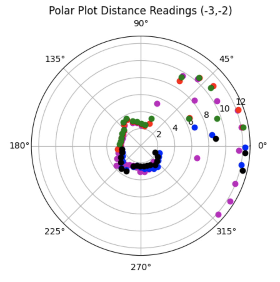 This section details the second attempt at collecting data at each point. The data collected for each point in the lab is plotted in the below graphs. I readjusted the ToF sensor to point more upwards before collecting the following data. This adjustement removed noise from inside the map region. The data collected for each point in the lab is plotted in the below graphs.