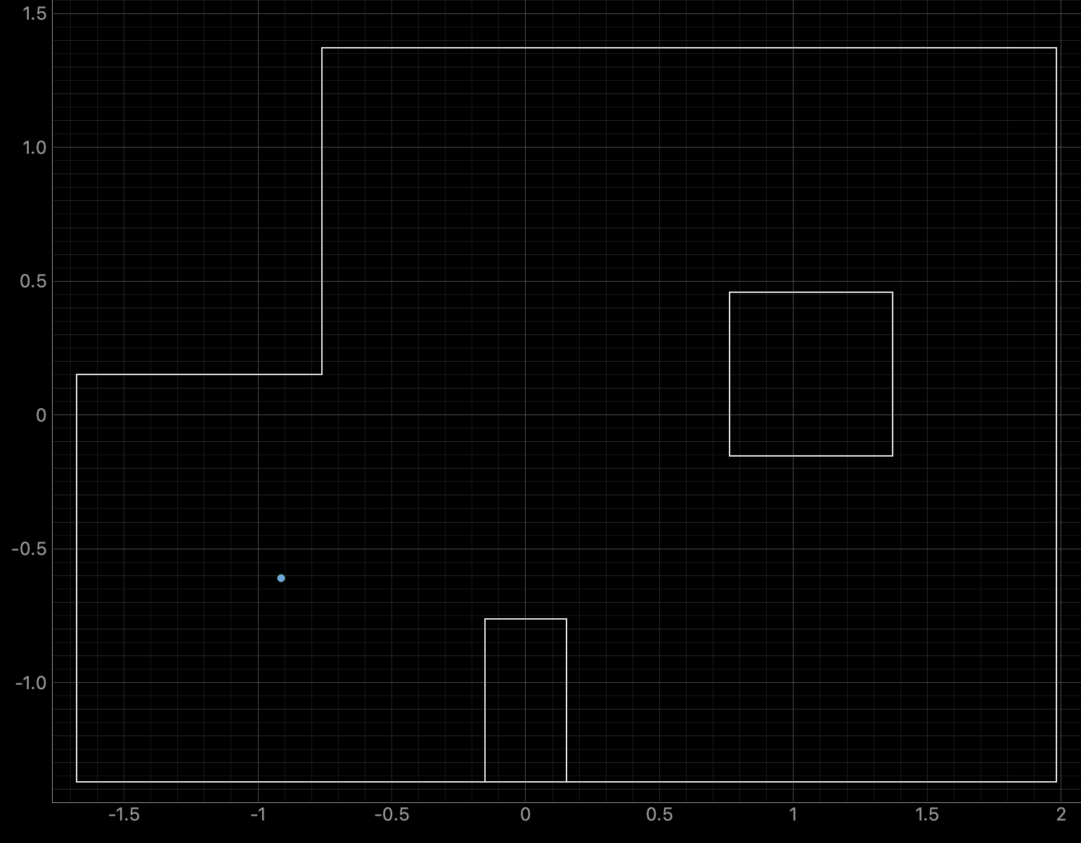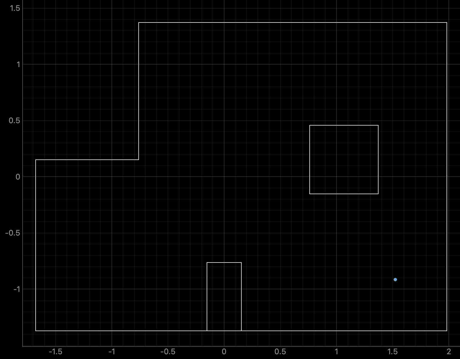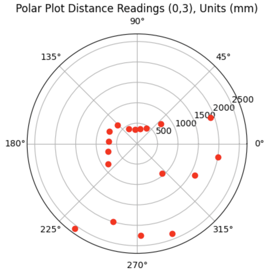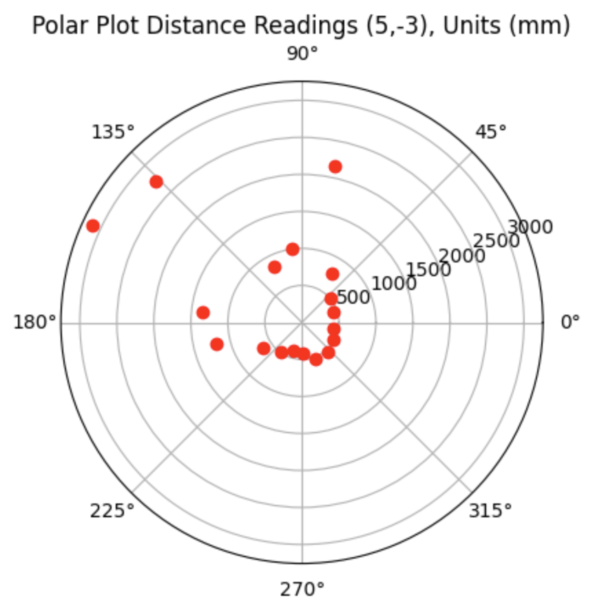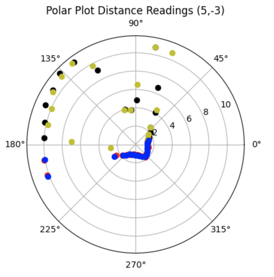 This section details the second attempt at collecting data at each point. The data collected for each point in the lab is plotted in the below graphs. I readjusted the ToF sensor to point more upwards before collecting the following data. This adjustement removed noise from inside the map region. The data collected for each point in the lab is plotted in the below graphs.