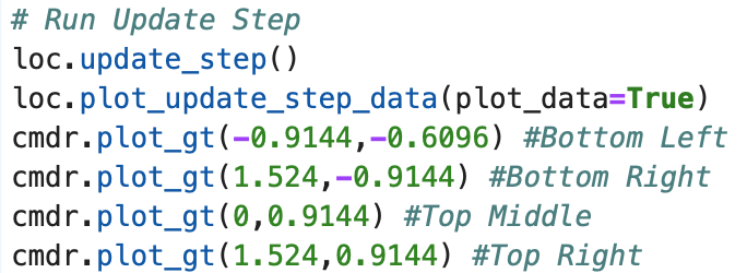 The results of rotating the robot at the four marked positions are below. The four marked positions include: (-3ft, -2ft, 0deg), (0ft, 3ft, 0deg), (5ft, -3ft, 0deg), and (5ft, 3ft, 0deg). The robot was run around 4-5 times at each point. Two runs for each point are shown below. The ground truth is plotted as the green dot and is the location where the robot rotated. The belief of the robots position is plotted as the blue dot. The ToF sensor used to collect distance readings was located on the front of the robot, between the left and right sides of the robot. When the robot was at zero degrees the ToF sensor was pointed towards the rightside wall. The robot turned counterclockwise in the same manner as in Lab 9. The Jupyter Notebook code to plot each Ground Truth value is below: