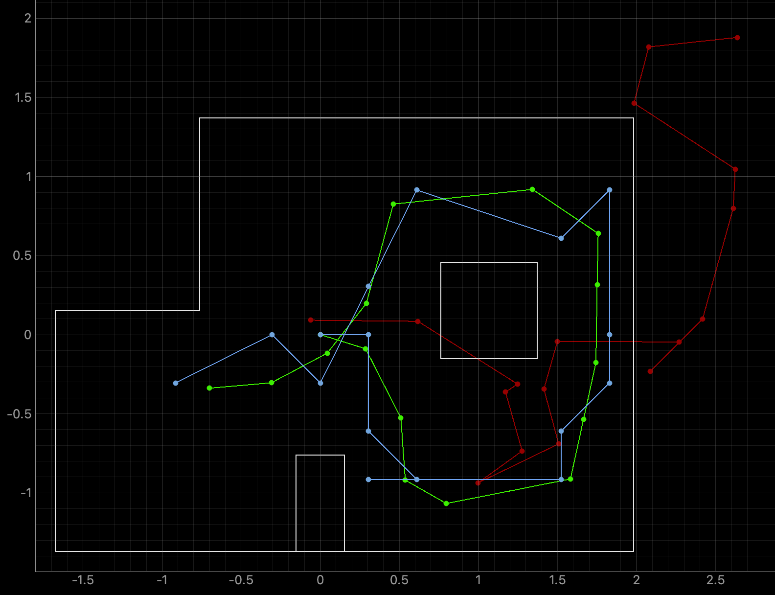 Two runs of the Bayes Filter simulation are found below. The green line is the ground truth, the blue line is the belief, and the red line is the odometry measurements. The lighter grid cells represent a higher belief. For both runs the ground truth and the belief are close together. Both runs were 15 iterations.