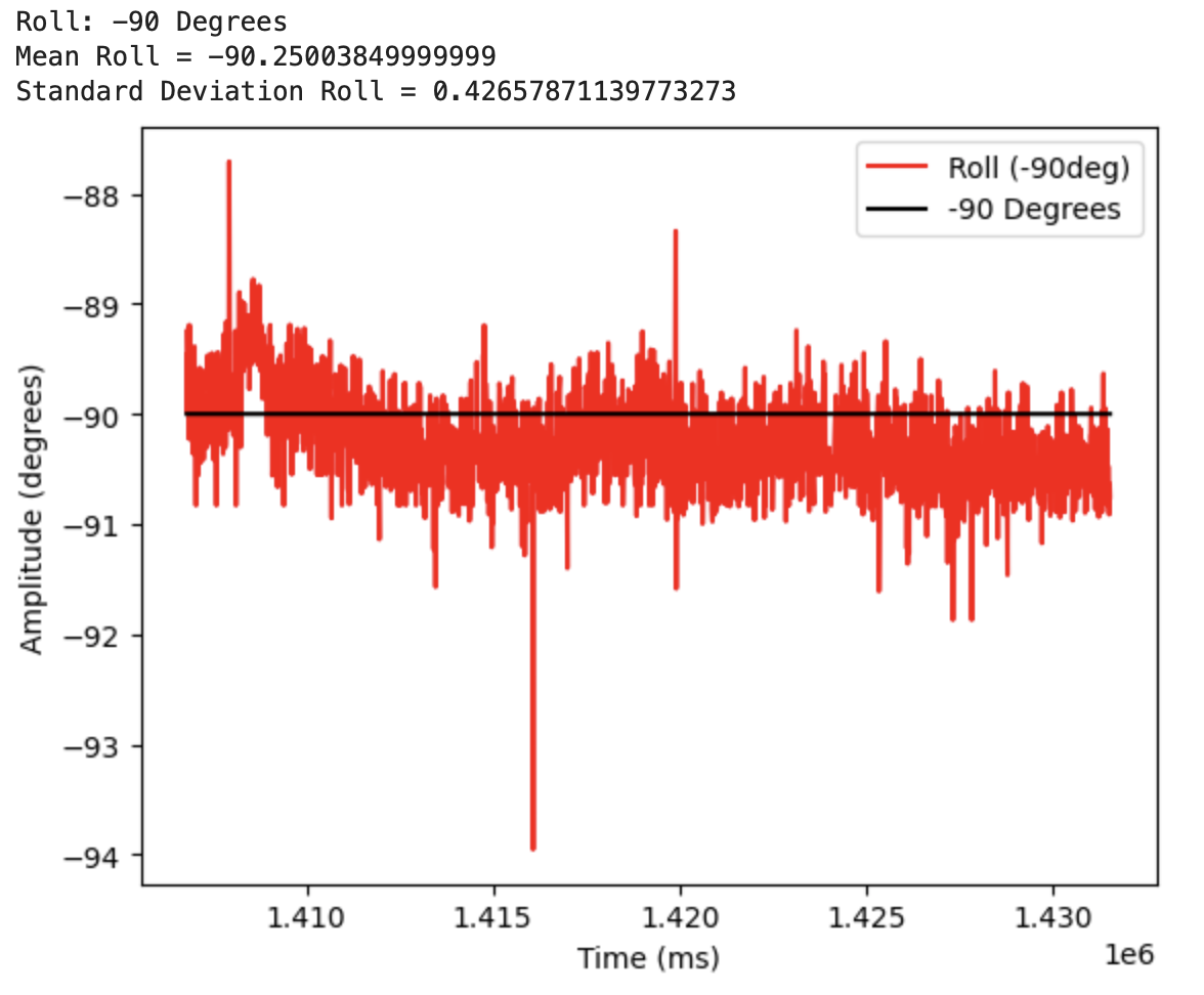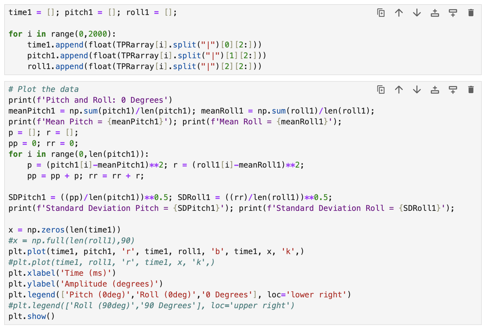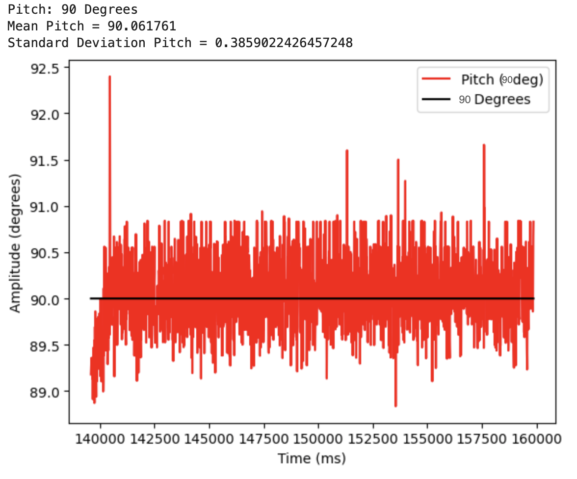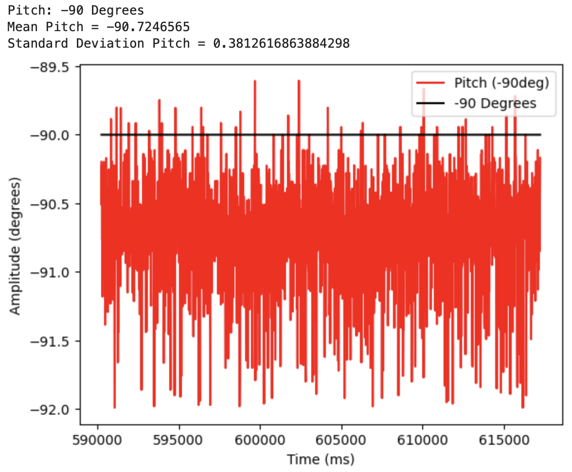 I plotted the data for pitch and roll at 0, 90, and -90 degrees in Jupyter Notebook and calculated the mean and standard deviation.