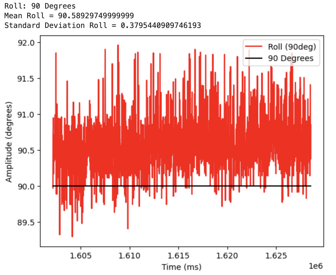 Below are graphs. I also included a black line at 0, 90, or -90 degrees for reference. Note: The data for the graphs was collected by holding the IMU against the table using my hand. This may have resulted in some error due to the surface level or any small hand movements. In the future the IMU should be calibrated when it is secured to the robot to achieve the most accurate pitch and roll data.