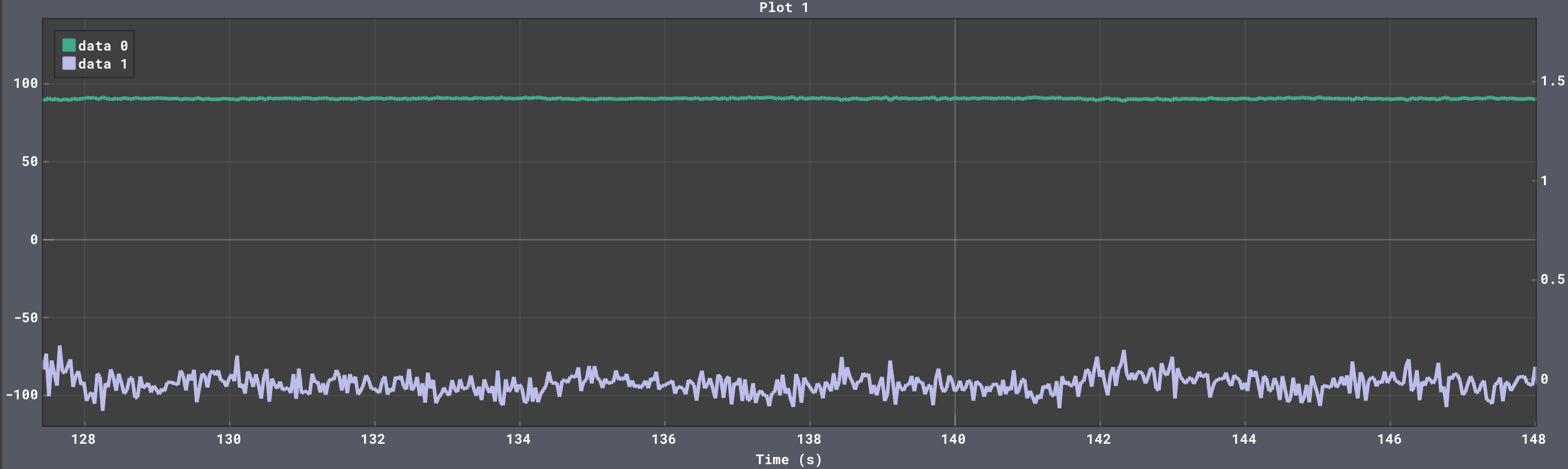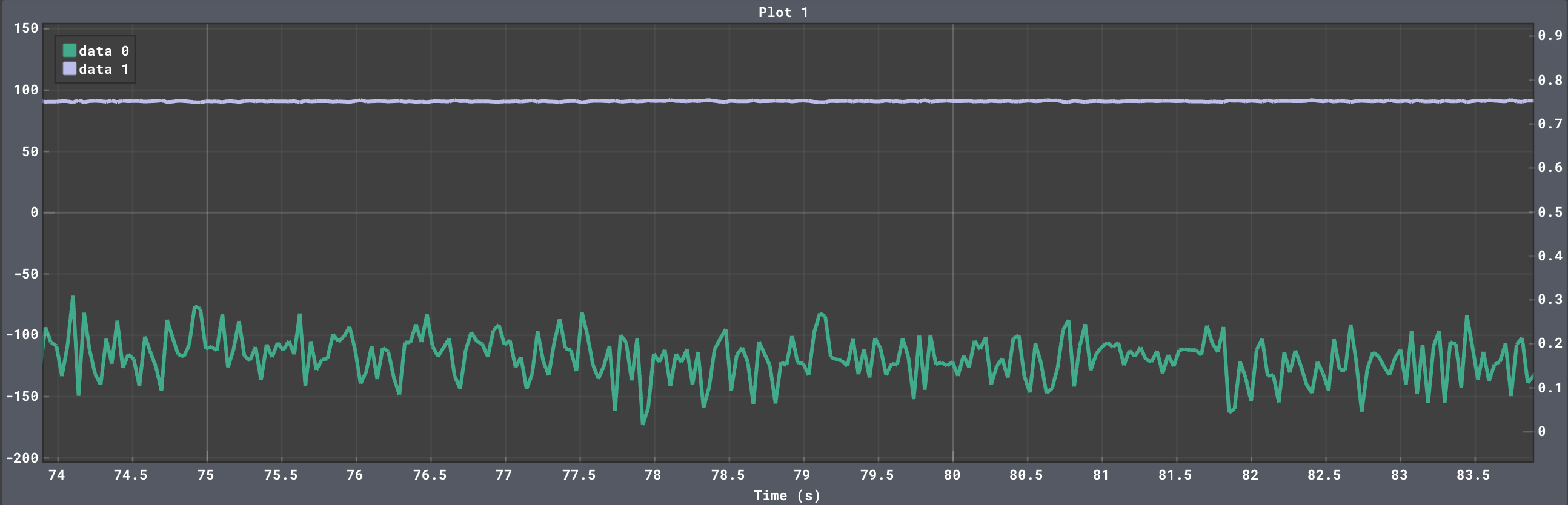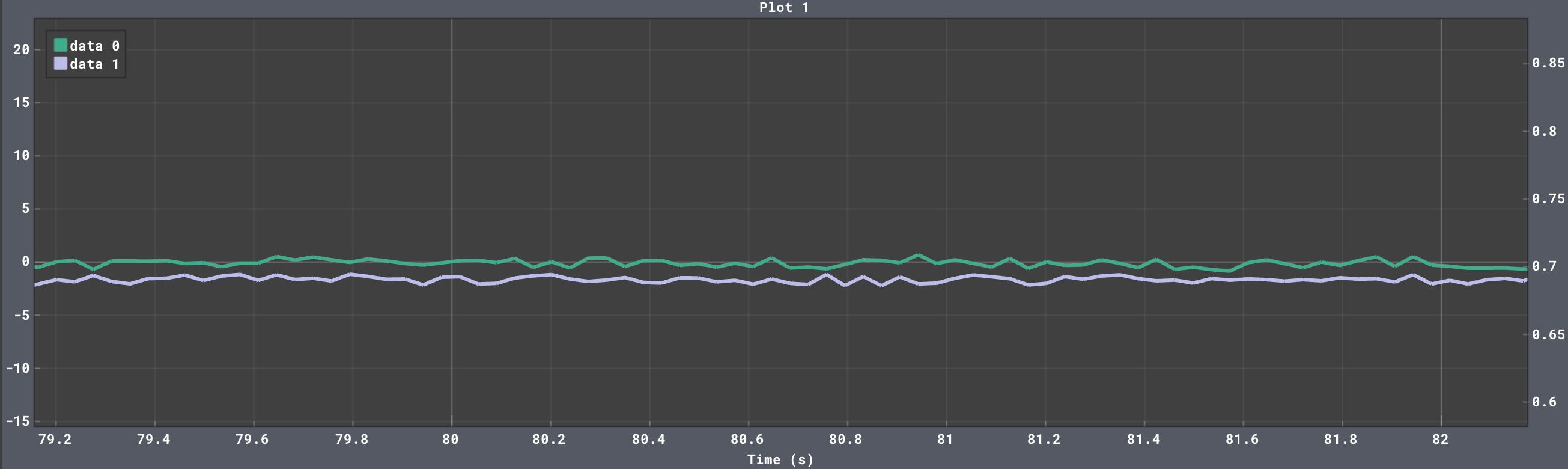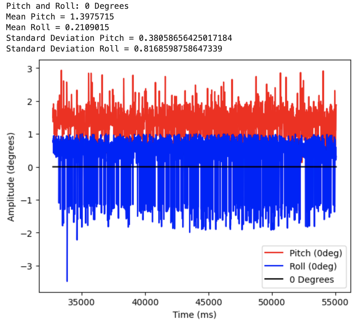 The below graphs show Pitch (data 0, green) and Roll (data 1, purple) at 0 degrees. The x-axis is time (sec) and the y-axis is degrees.
