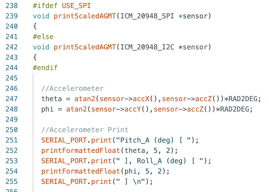These equations were used to compute pitch and roll for the accelerometer. I implemented the calculations in the Example1_Basics sketch (lines 247 - 255 below) that was used in the previous task to receive continuous data from the Artemis board and plot the results.