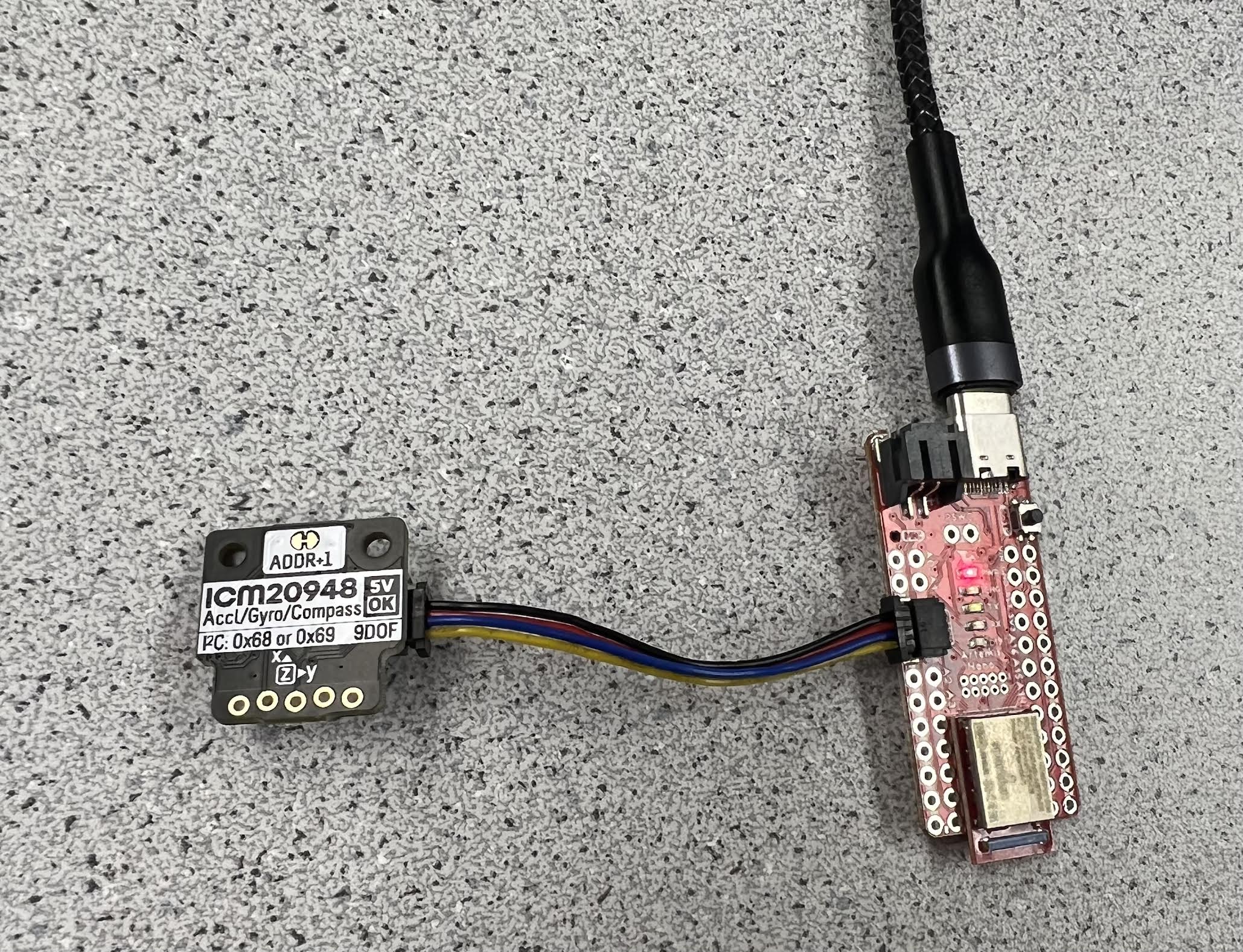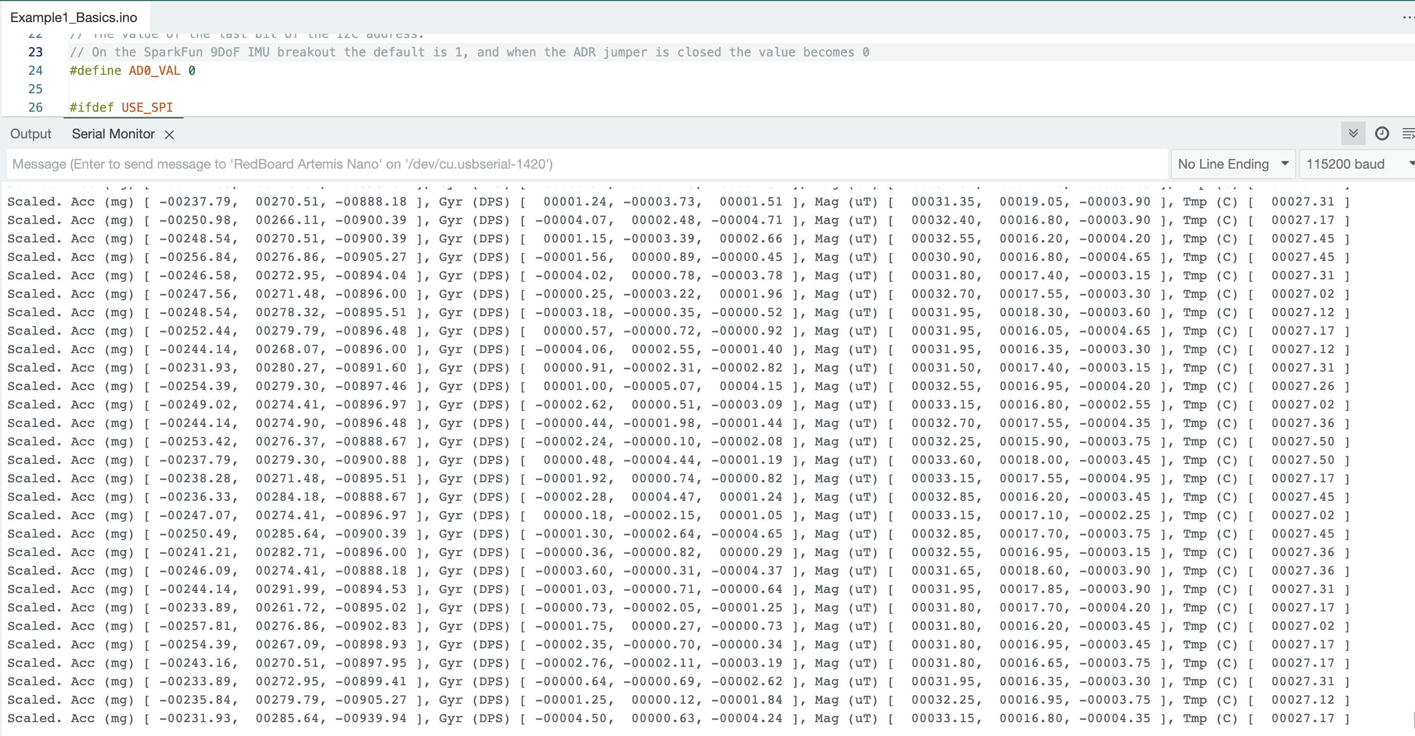 The example code found under SparkFun 9DOF IMU Breakout - ICM 20948 - Arduino Library->Arduino->Example1_Basics was run to test if the IMU was working correctly.