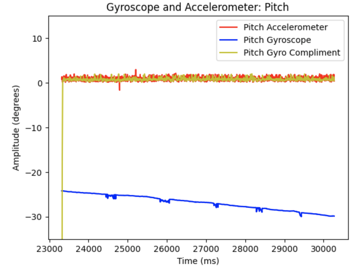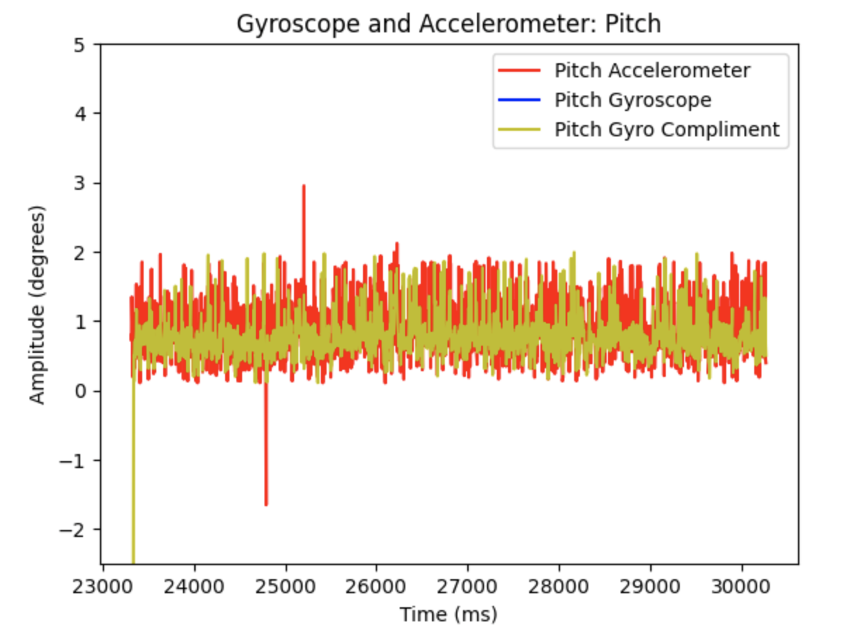 Pitch for Gyroscope (Blue), Gyroscope Complimentary Filter (Orange), and Accelerometer (Teal):