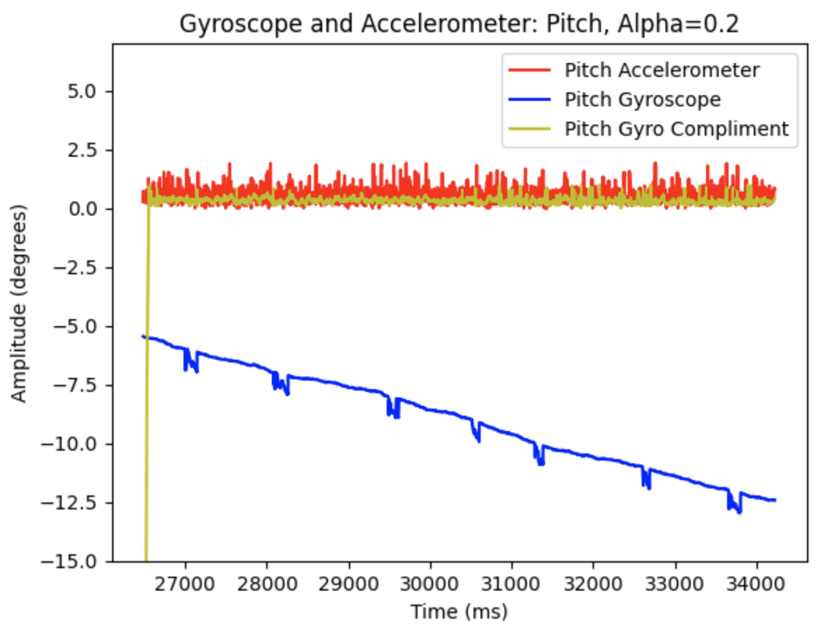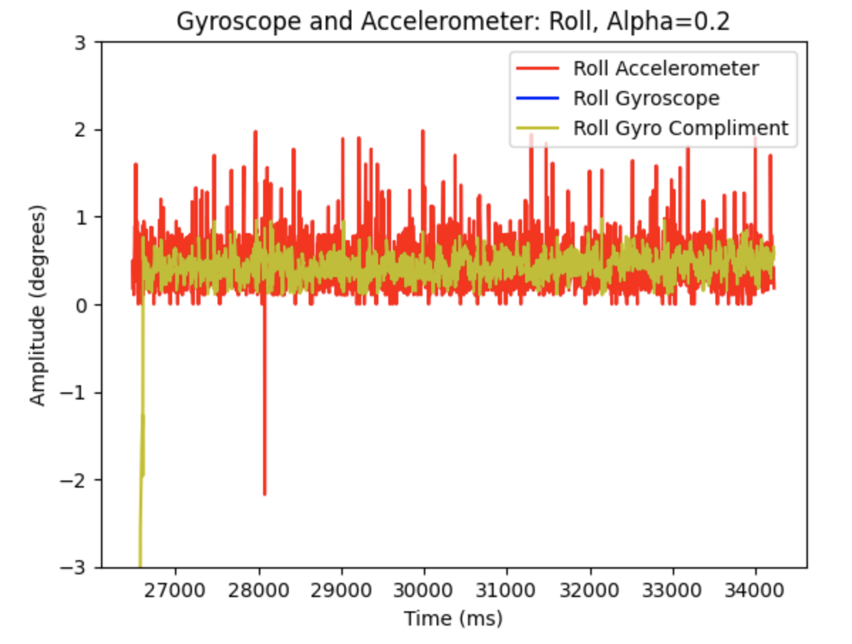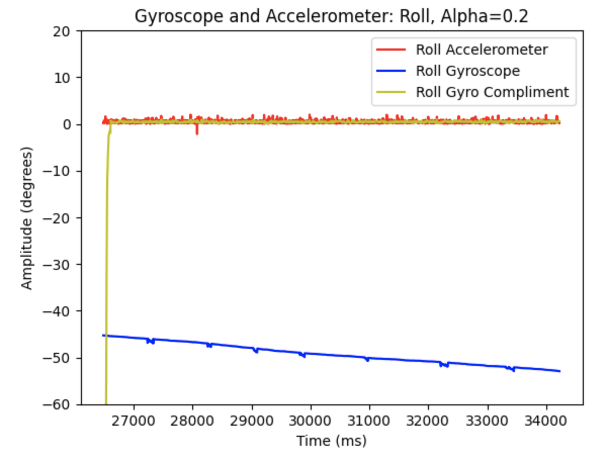 The complimentary filter shows resistance to small vibrations as the IMU is moved during data collection. The complimentary filter reduces noise compared to the accelerometer output. Alpha is a set constant that represents how well the accelerometer output measures the correct pitch and roll data. I examined how different alpha values affected the graphs. In the below graphs alpha = 0.5