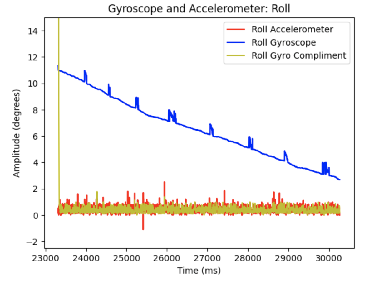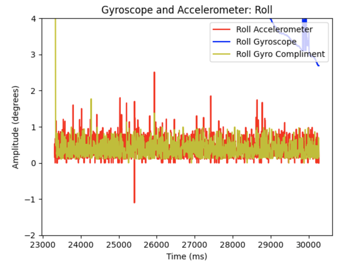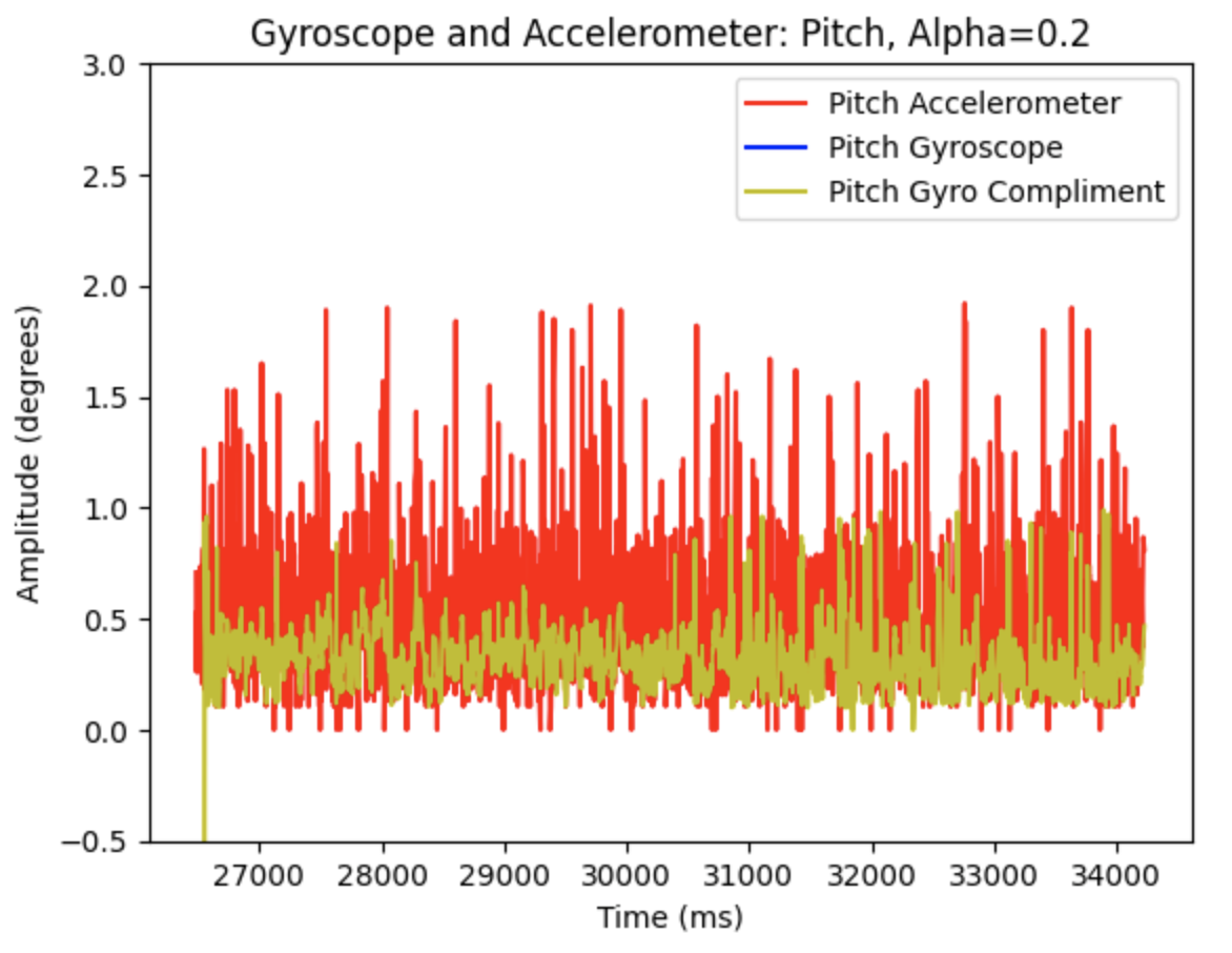 The complimentary filter shows resistance to small vibrations as the IMU is moved during data collection. The complimentary filter reduces noise compared to the accelerometer output. Alpha is a set constant that represents how well the accelerometer output measures the correct pitch and roll data. I examined how different alpha values affected the graphs. In the below graphs alpha = 0.5