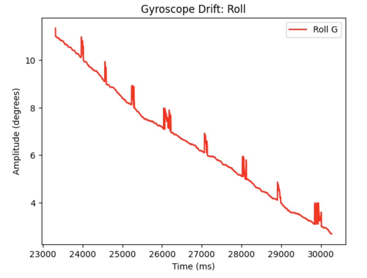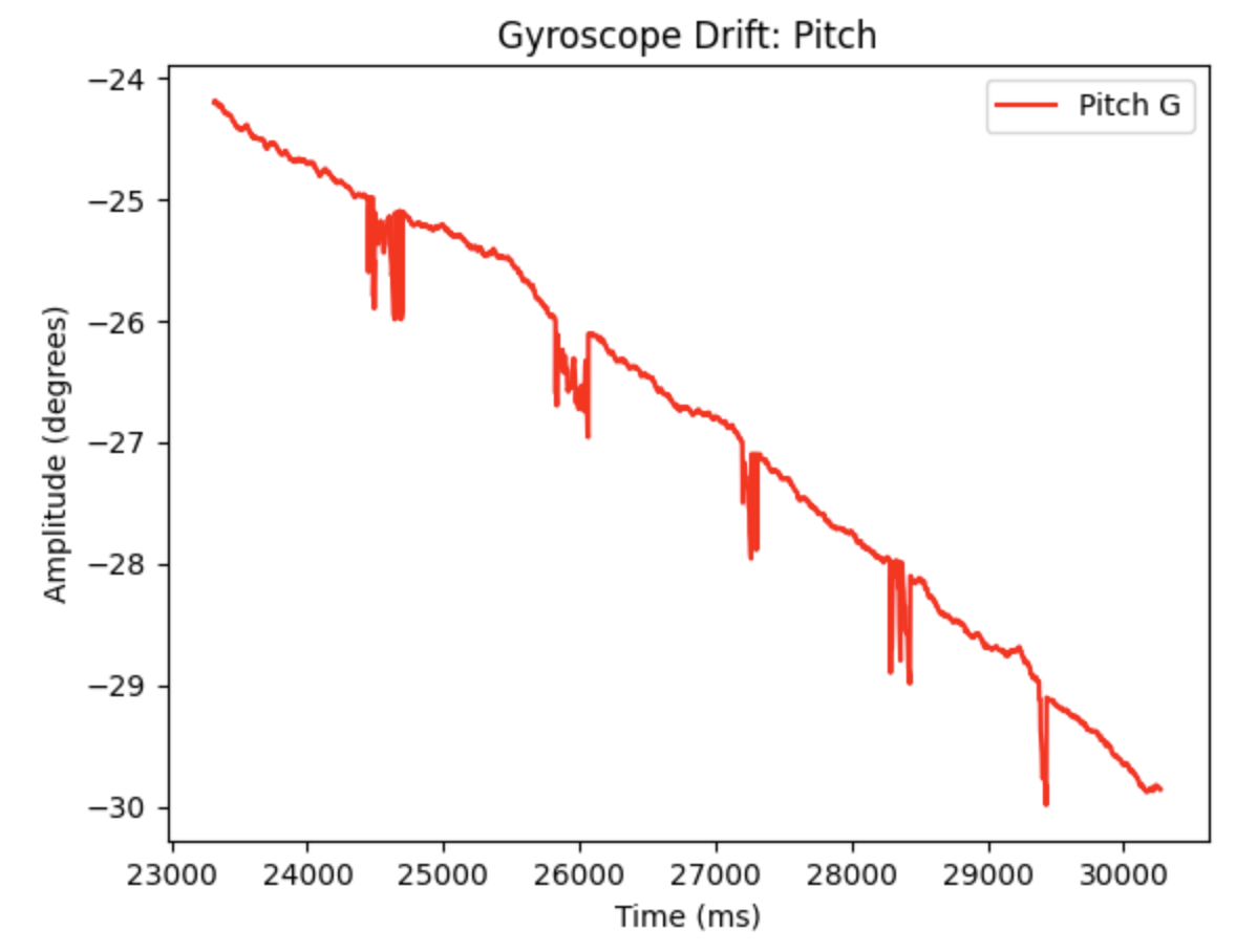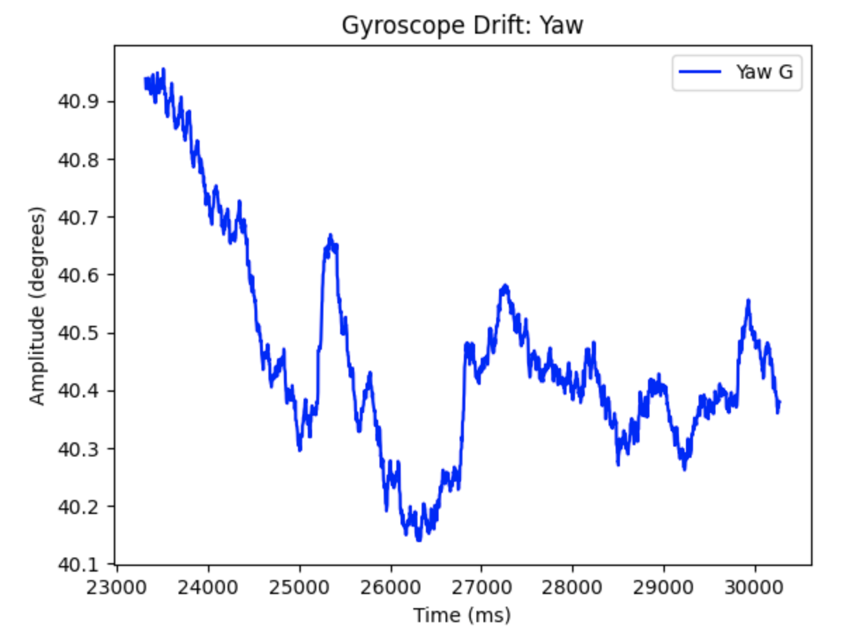 The drift for the gyroscope can be better seen in the below graphs. The gyroscope was held in the same position as the data was collected. As time increases the measurements drift away from the starting value.
