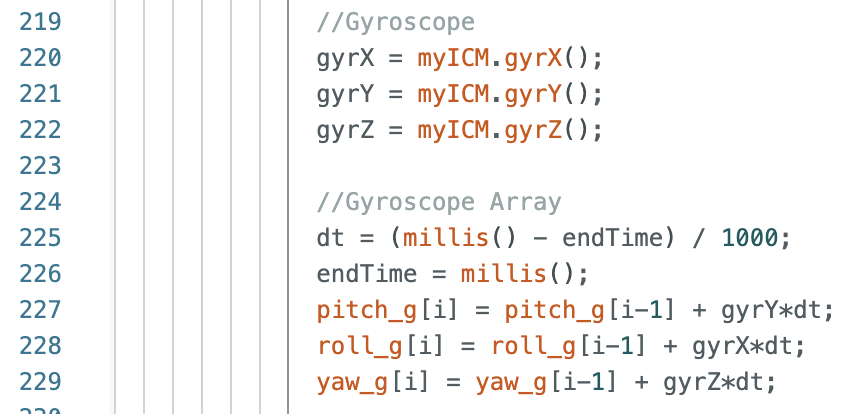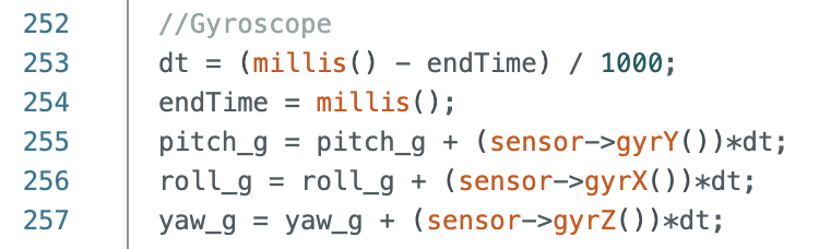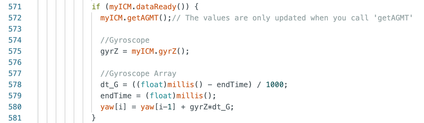 These lines of code are within the larger while loop and each time the while loop runs the gyroscope updates the sensor readings. Yaw is then found using the previous yaw reading, the gyroscope reading, and the calculated difference in time.