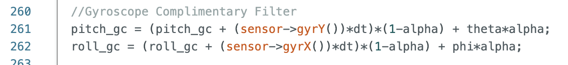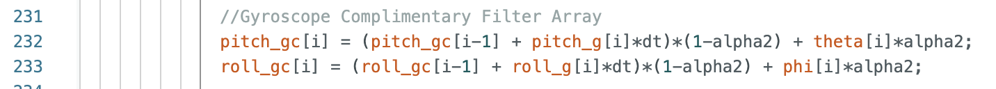The final derivative calculation used the previous gyroscope output combined with a low pass filter with an alpha of 0.3055 to remove some of the noise. The calculation for alpha is found below along with the final code to find the derivative control.