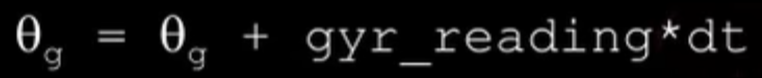 The gyroscope measures angular velocity. To find pitch, roll, and yaw the data collected from the IMU needs to be multiplied by a time step (dt in the below code).