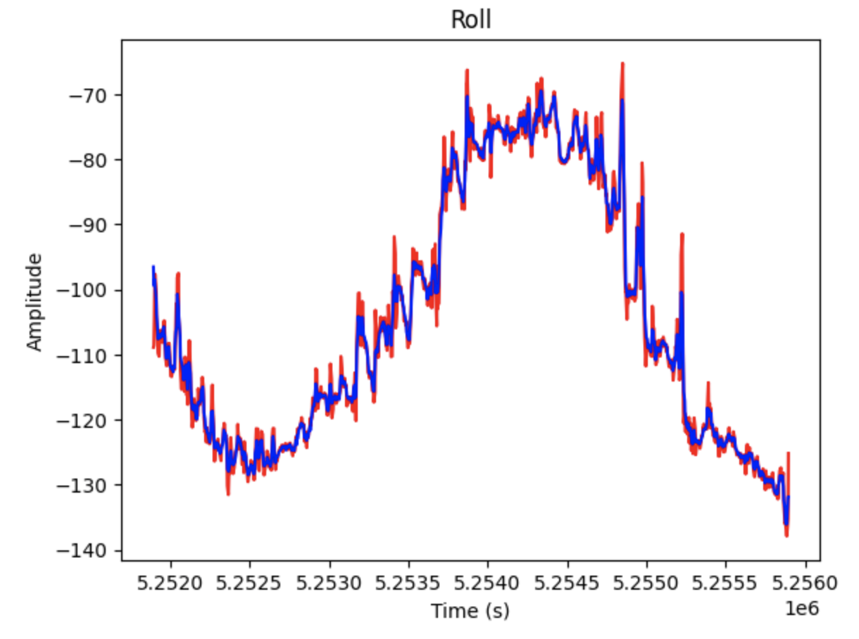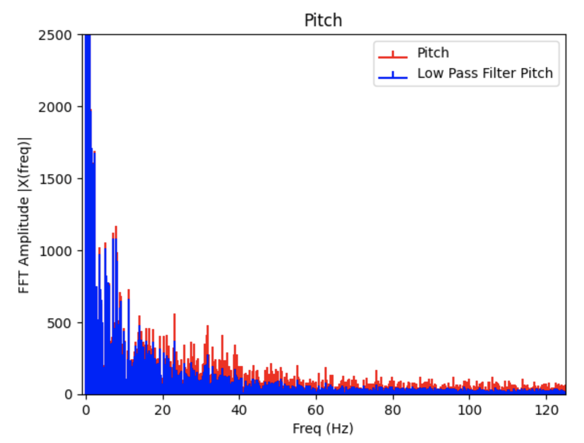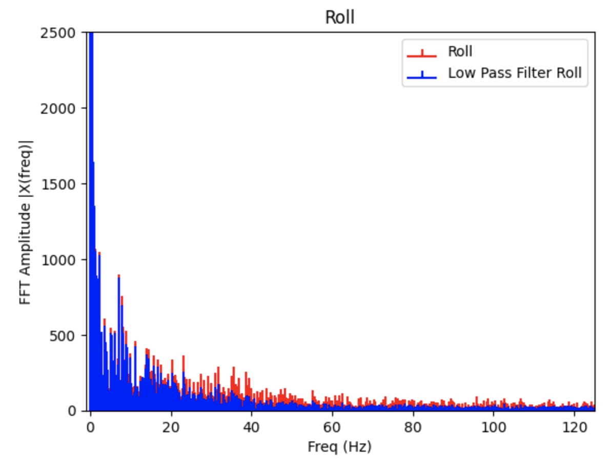 The below FFT graphs show the original signal (red) and the reduction in noise after implementing a low pass filter (blue). Choosing a lower cut off frequency reduces more noise.