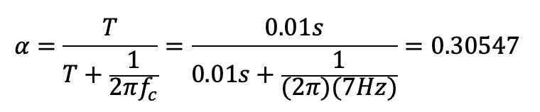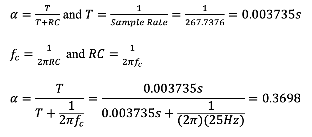 From observing the above graphs, I choose a cutoff frequency of 25Hz to use for a low pass filter. Using the determined cutoff frequency, I calculated the alpha used in the low pass filter. The equations from lecture are below: