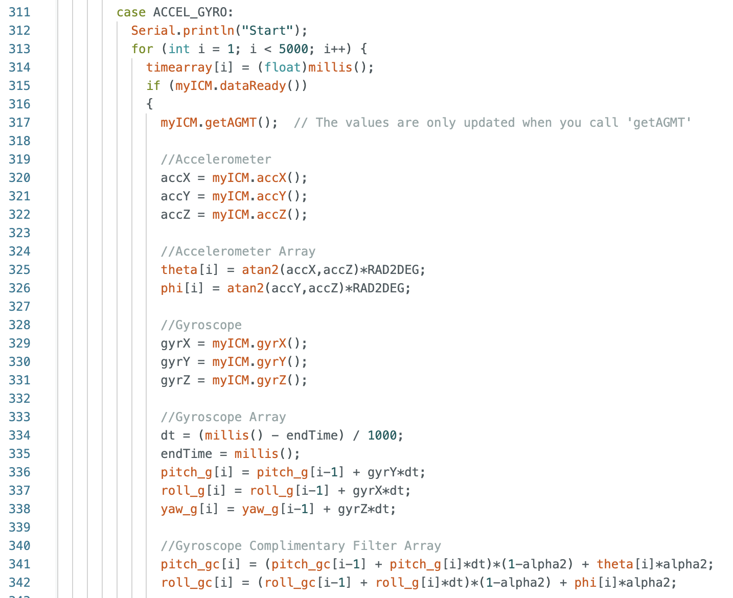 The first function that I wrote for the lab was the function Kalman_Filter() that is called from inside the larger while loop. To perform this task, I referenced the Jupyter Notebook code I wrote for Lab 7 and modified the code for the Arduino IDE syntax. The function can be seen below: