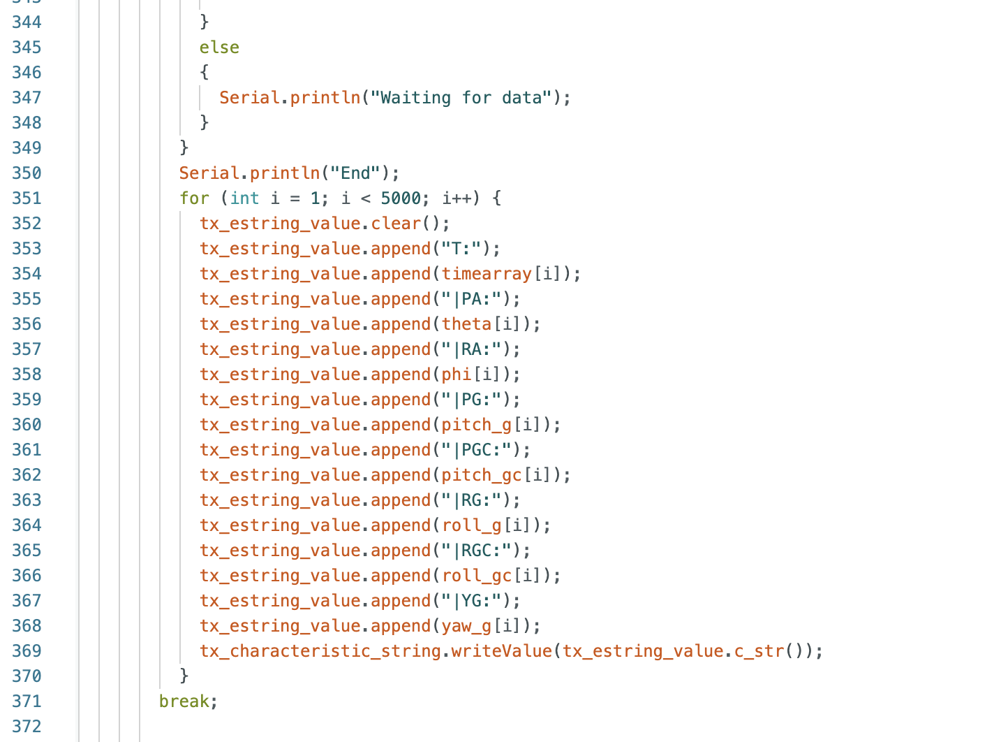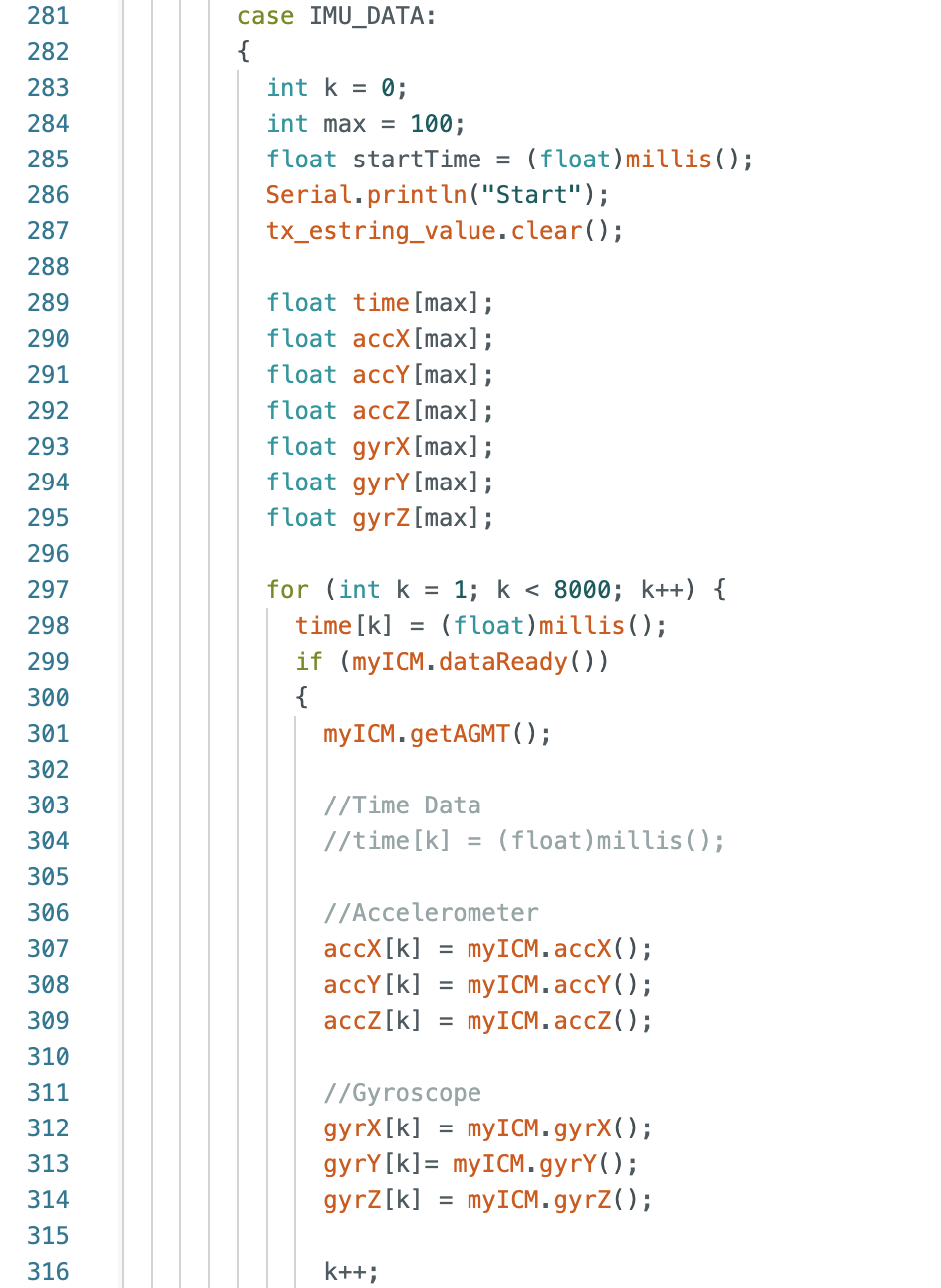 All of the accelerometer and gyroscope data print statements and any delays in the ble_arduino.ino file were removed in order to speed up the execution of the main loop. A case called "ACC_GYR" was created that checked if the data was ready in the main loop, and if there was data available stored it in arrays. After speeding up the loop I found that new values were sampled every 0.04s, which is a sampling frequency of 1/0.04s = 25Hz.