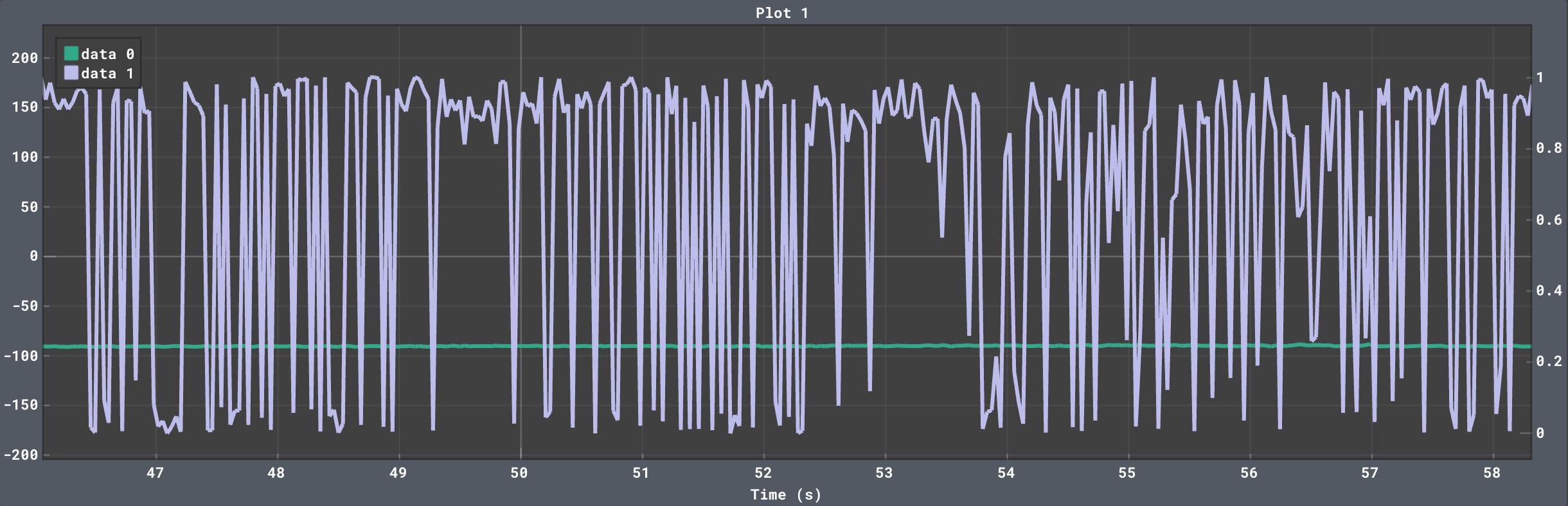 The below graphs show Roll (data 1, purple) at -90 and 90 degrees and the corresponding Pitch (data 0, green) outputs. The x-axis is time (sec) and the y-axis is degrees.