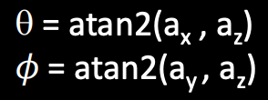 The following equations for pitch (theta) and roll (phi) were found in the FastRobots-4-IMU Lecture Presentation.