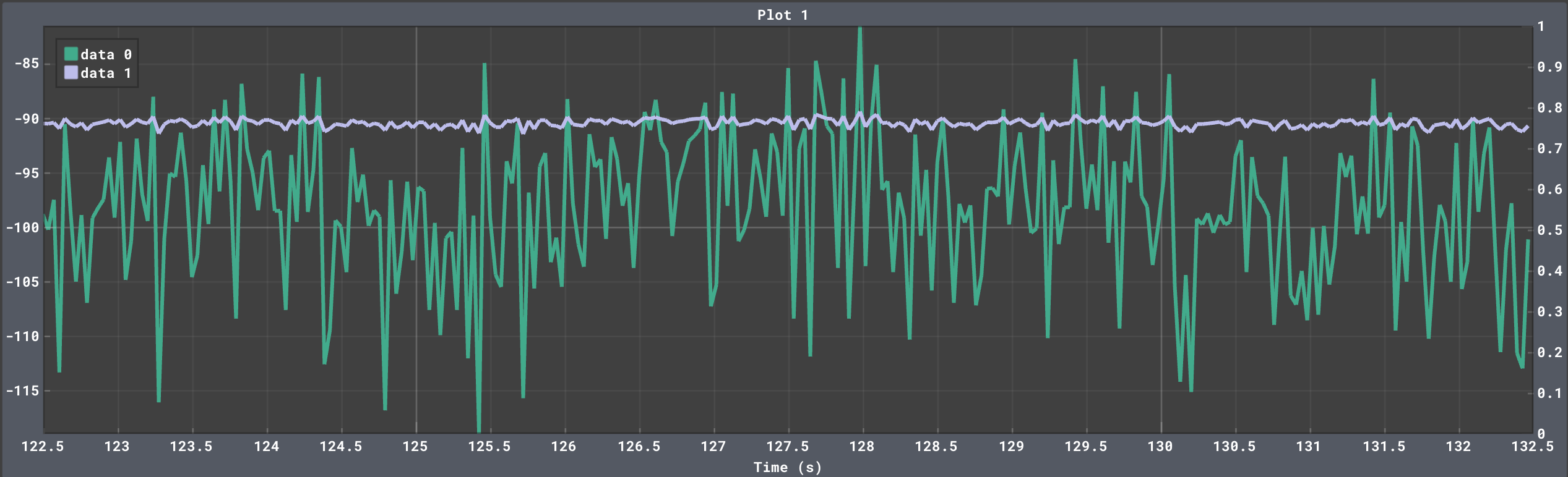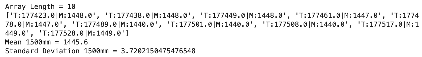 To find the data transfer rate the length of the data was computed by assembling the individual outputs into an array in the Jupyter Notebook. The number of strings in each element of the array is 9, and the number of elements in the array is 748. The time difference of the final (40.428s) and starting time (35.434s) was found to be 4.994 seconds. The data transfer rate is (748*9)bytes/4.994seconds = 1348.018 bytes/second