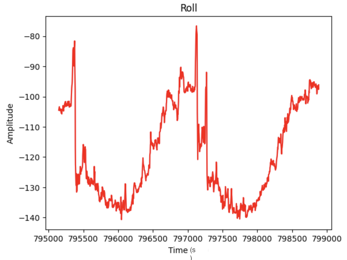 The below graphs show Pitch (data 0, green) at -90 and 90 degrees and the corresponding Roll (data 1, purple) outputs. The x-axis is time (sec) and the y-axis is degrees. From the graphs it can be seen that when pitch is at -90 degrees there is noise in the roll outputs.
