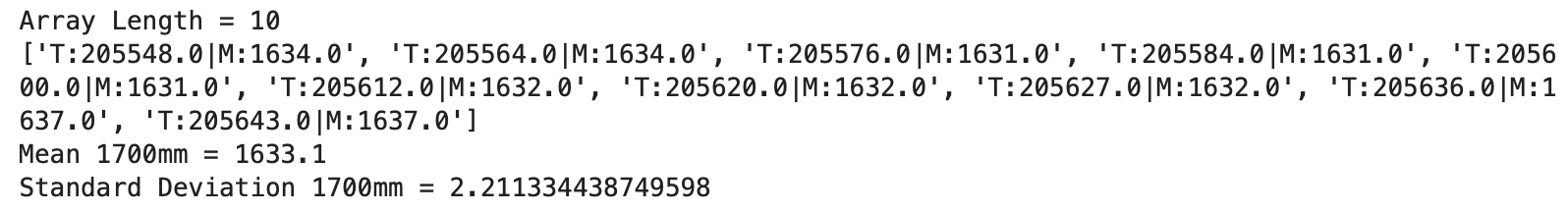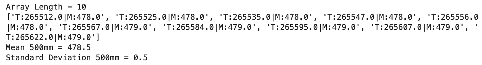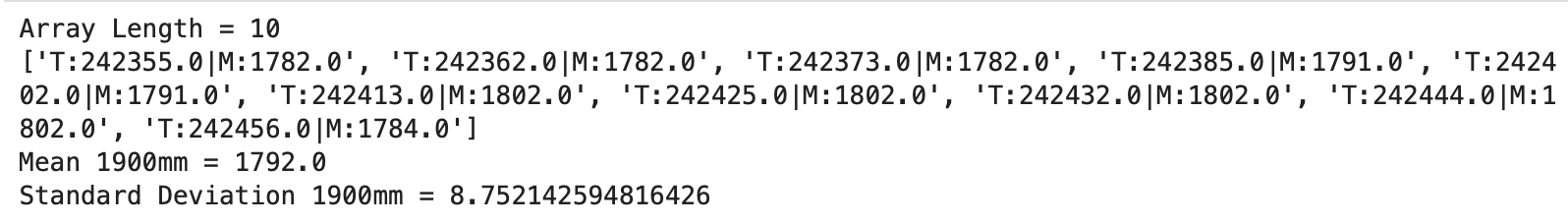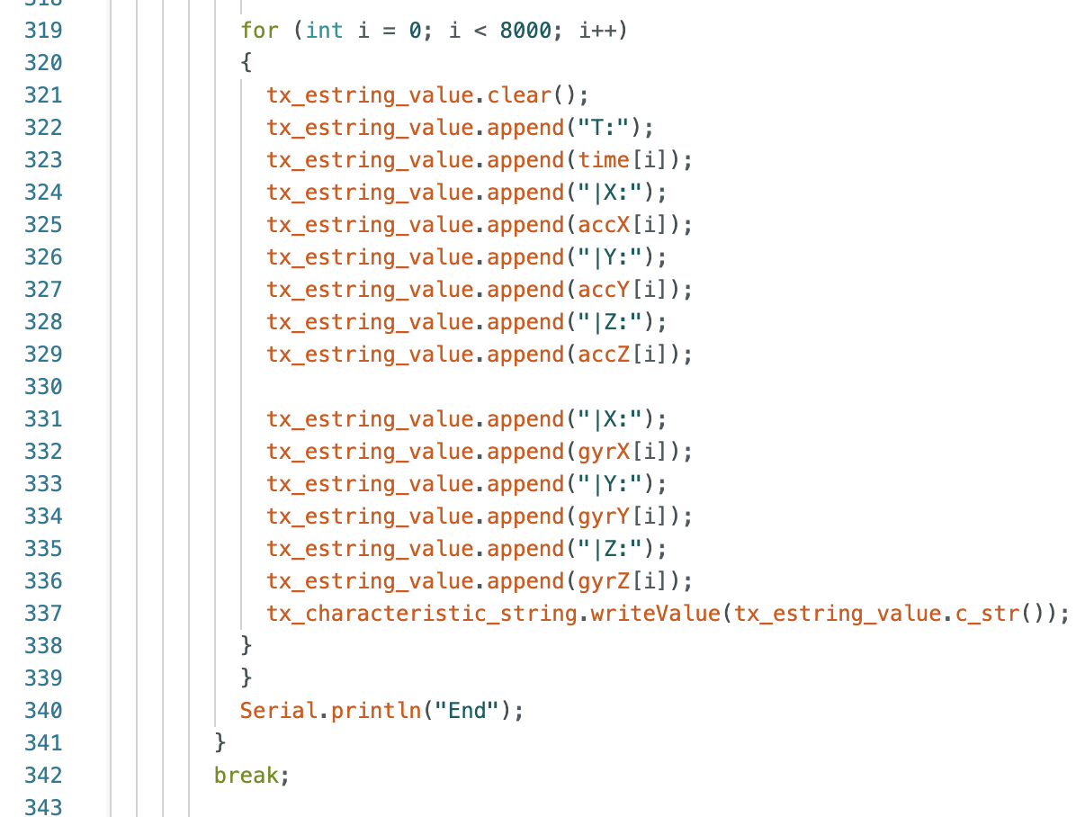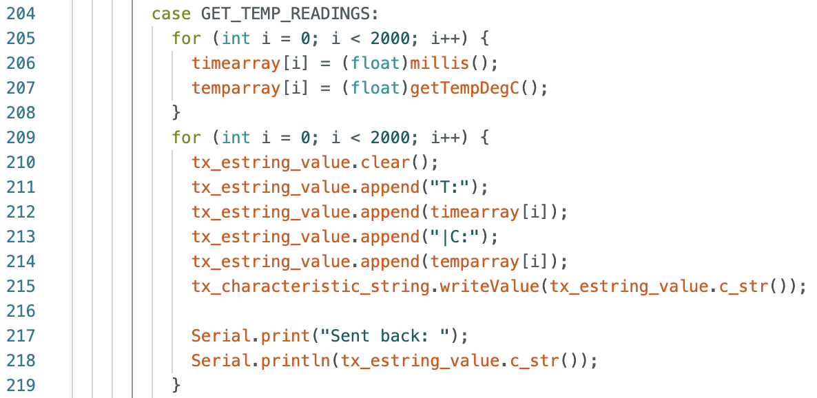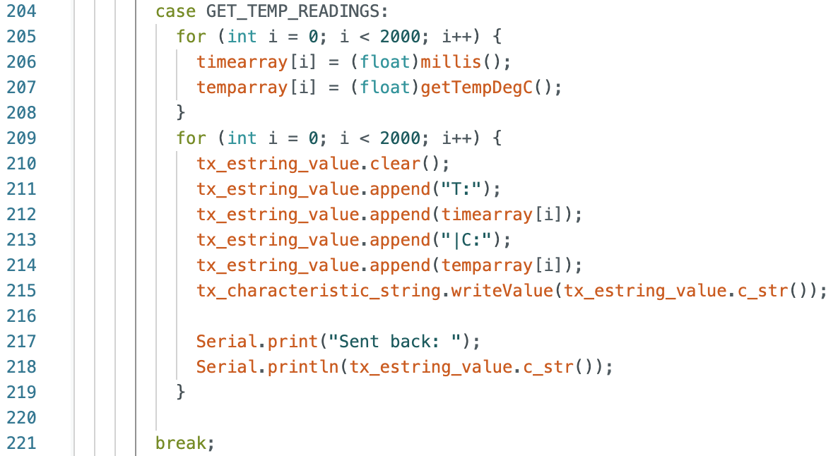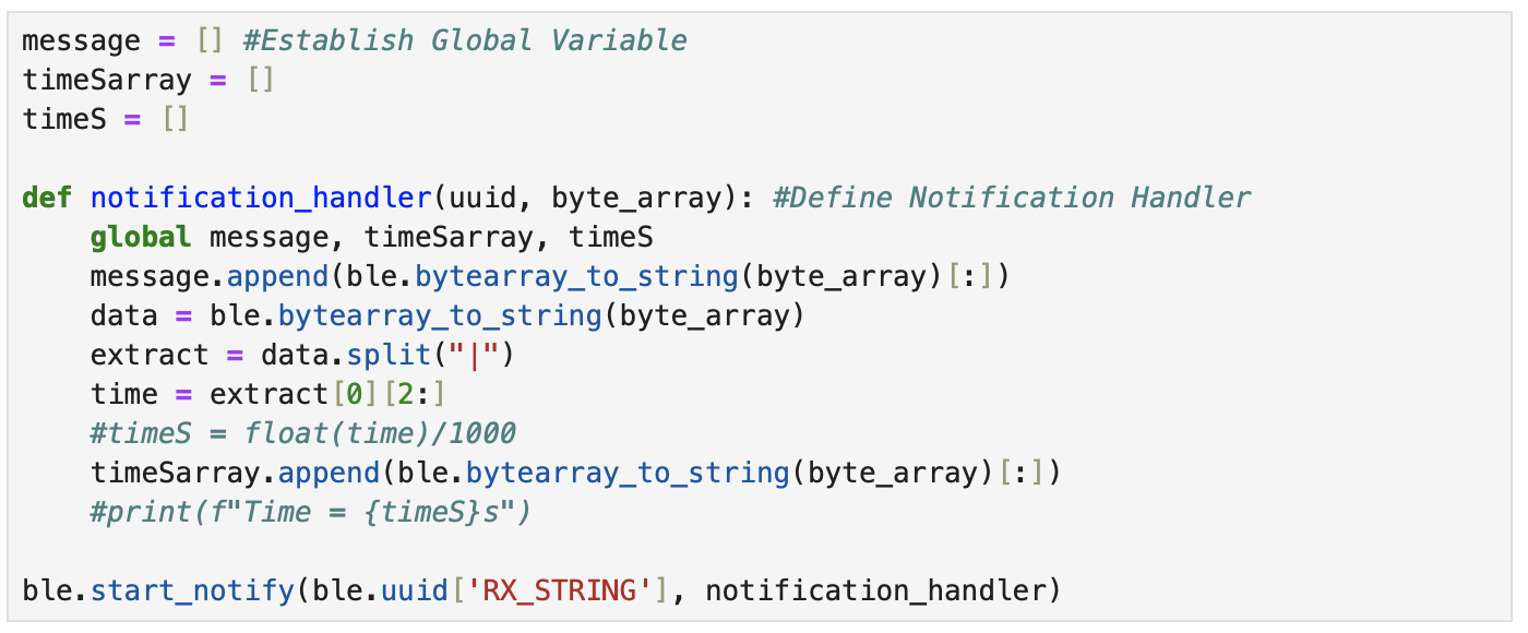 A globally defined array to store time stamps was implemented. Inside of the for loop each time stamp is put inside of the “timearray”. The data is then sent as an array to the computer using Jupyter Notebook.