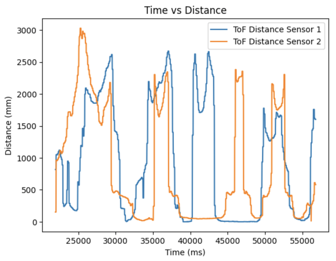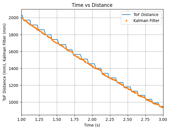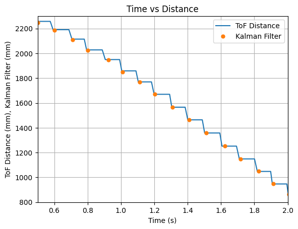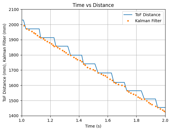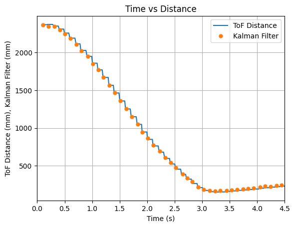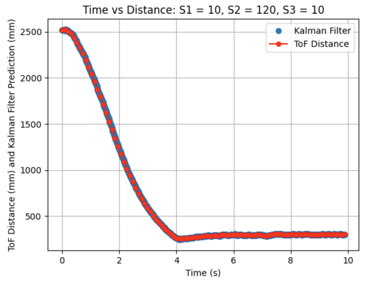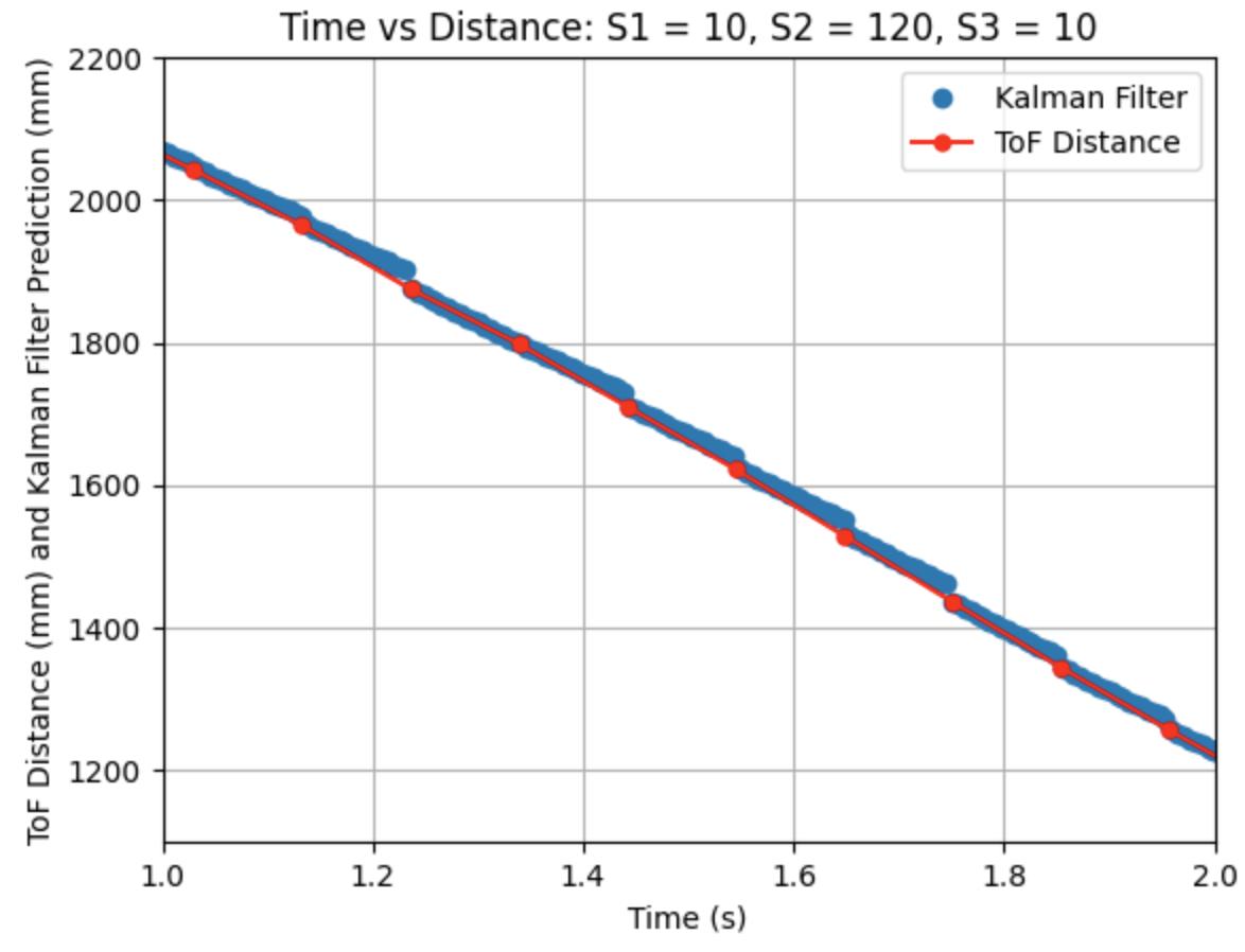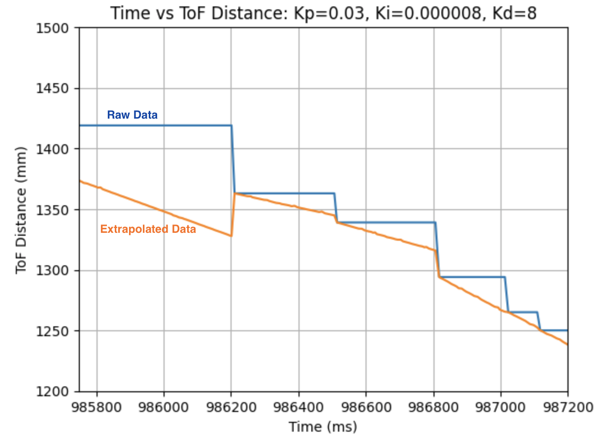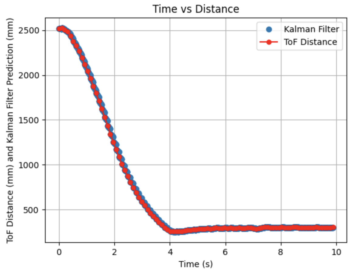 The PID controller was run using values of Kp = 0.05, Ki = 0.0000008, and Kd = 0.5. A test run showing the plotted ToF data and the Kalman Filter updates is shown below. It can be seen that the Kalman Filter updates align with each new reading of the ToF sensor.