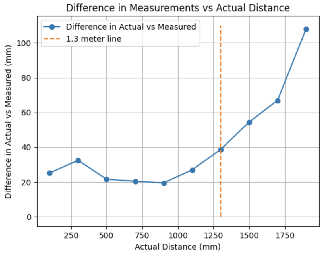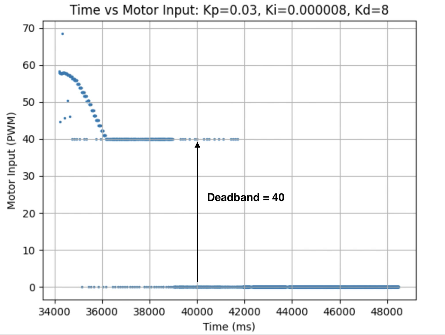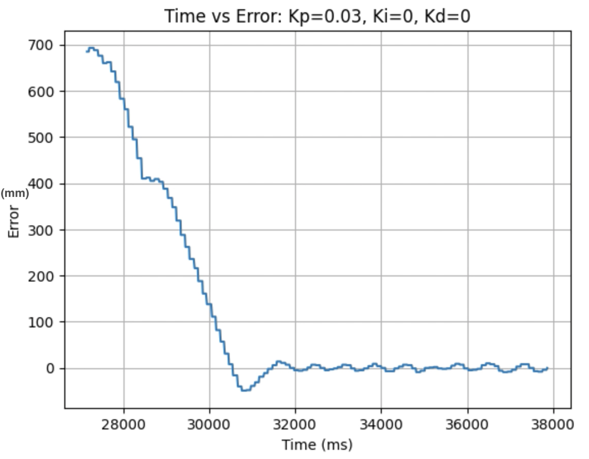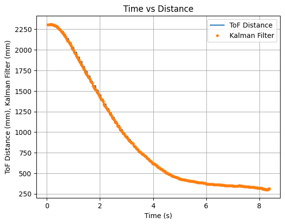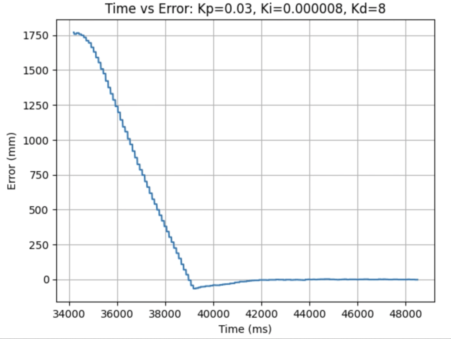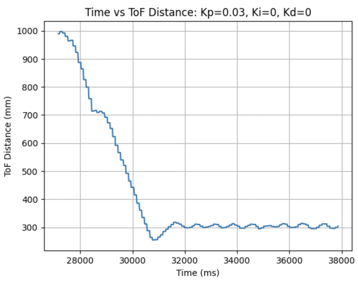 The PID controller was run using values of Kp = 0.05, Ki = 0.0000008, and Kd = 0.5. A test run showing the plotted ToF data and the Kalman Filter updates is shown below. It can be seen that the Kalman Filter updates align with each new reading of the ToF sensor.