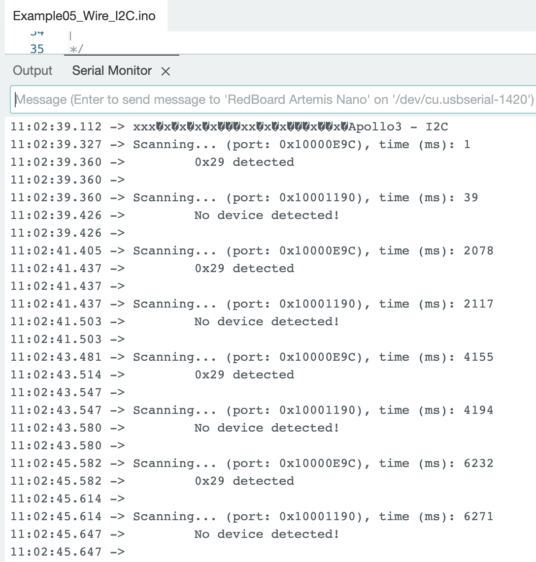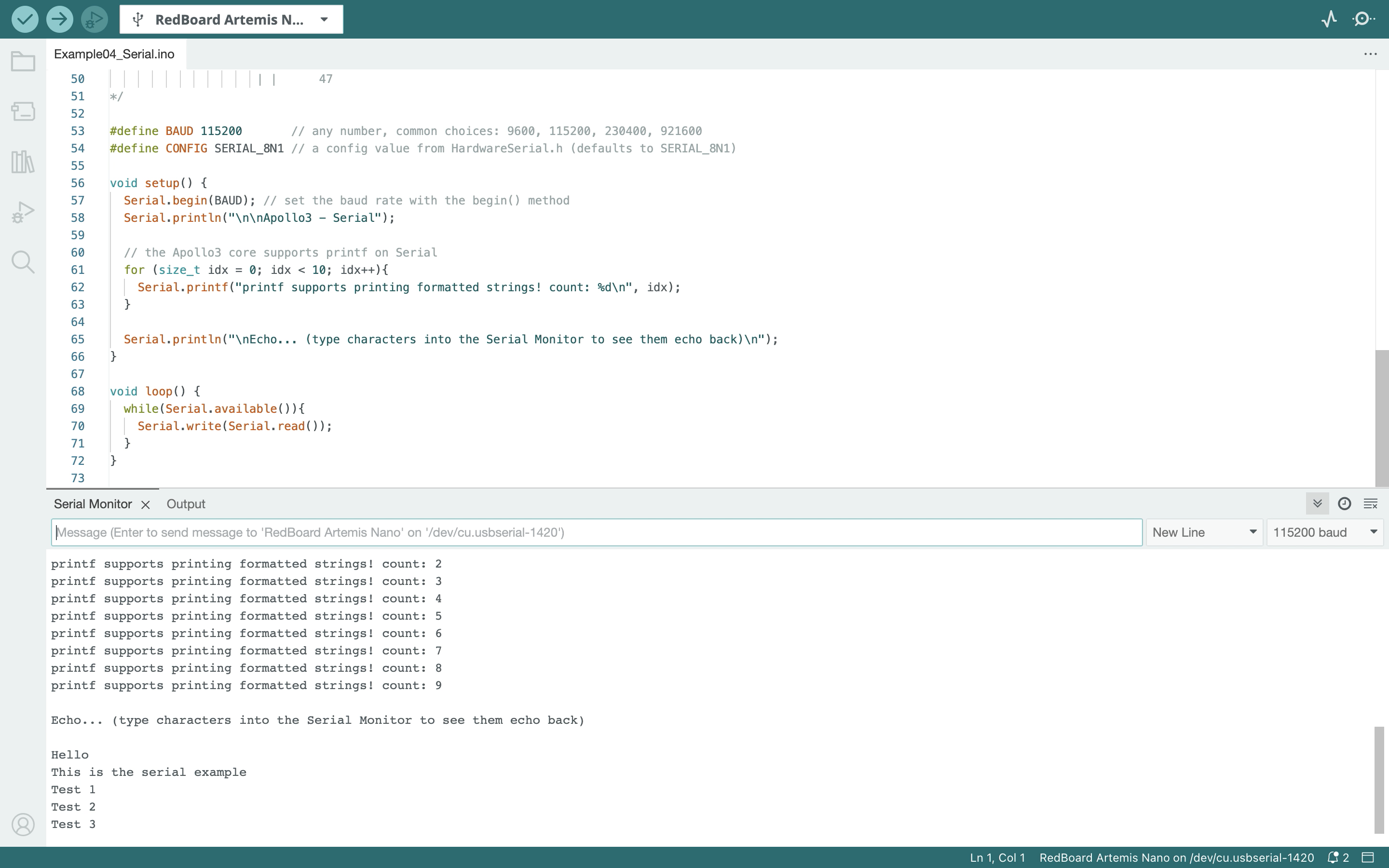 In this example serial communication between the Artemis board and the computer was tested. Example code: File->Examples->Apollo3->Example04_Serial.