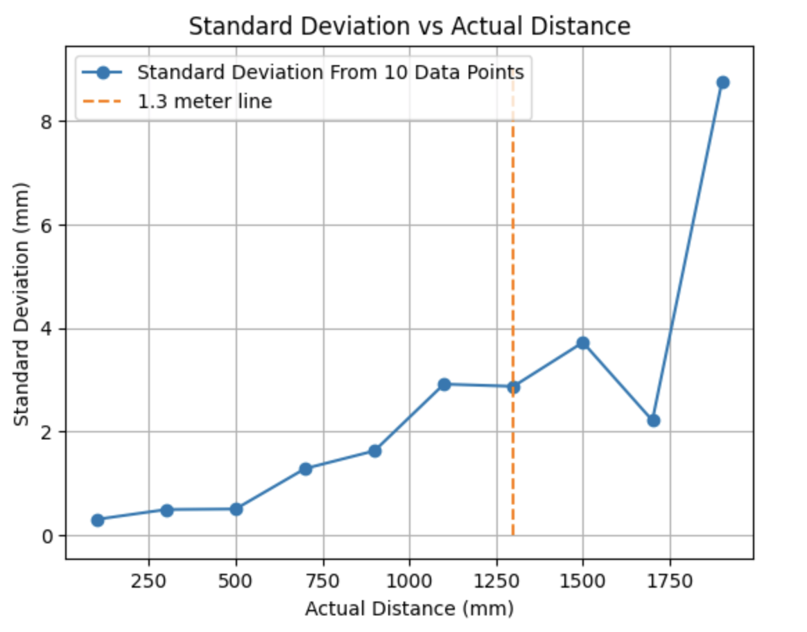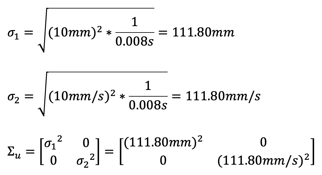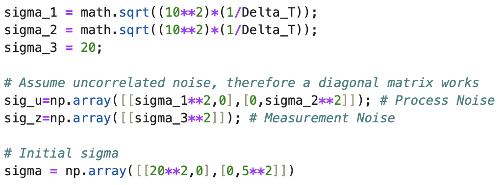 The process noise and the sensor noise covariance matrices need to be specified for the Kalman Filter to work well. Sigma_3 was initialized as 20. This value was determined from slide 35 in Lecture 13 as well as the ToF sensor datasheet. Sigma_Z represents the mistrust in the sensor readings. The ToF sensor has a ranging error of +/- 20mm in ambient and dark lighting.