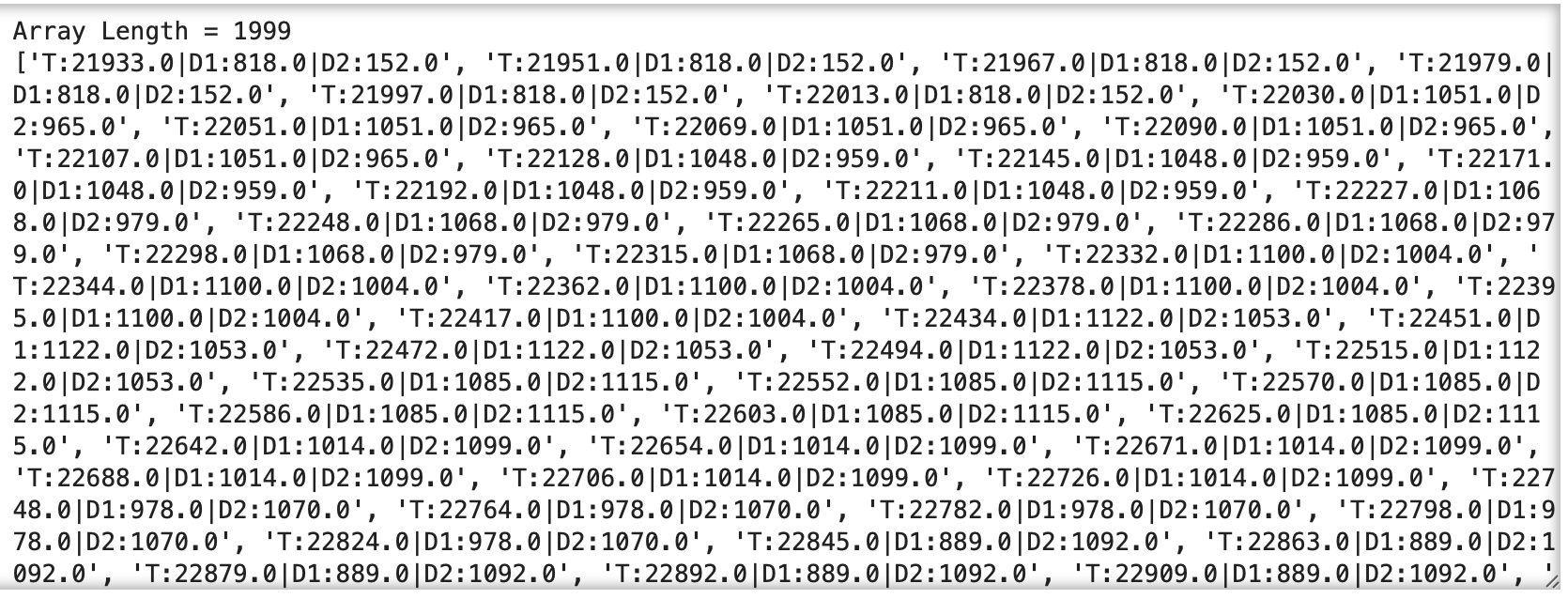 To find the data transfer rate the length of the data was computed by assembling the individual outputs into an array in the Jupyter Notebook. The number of strings in each element of the array is 9, and the number of elements in the array is 2748. The time difference of the final (49.730s) and starting time (49.685s) was found to be 0.045 seconds. The data transfer rate is (2748*9)bytes/0.045seconds = 549600 bytes/second