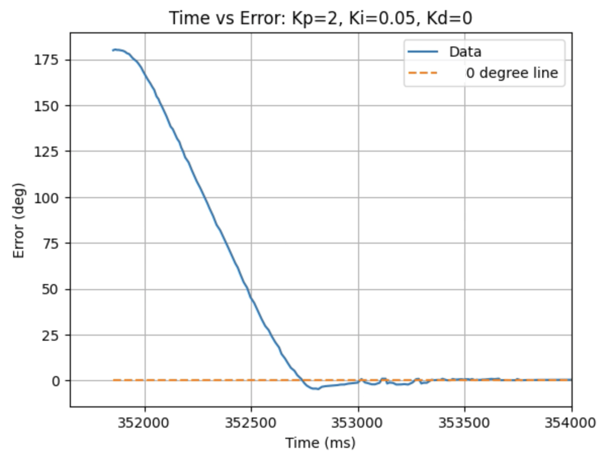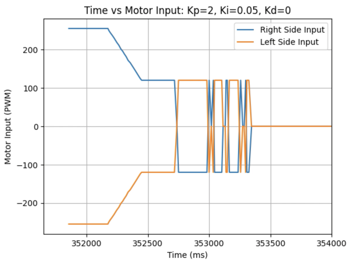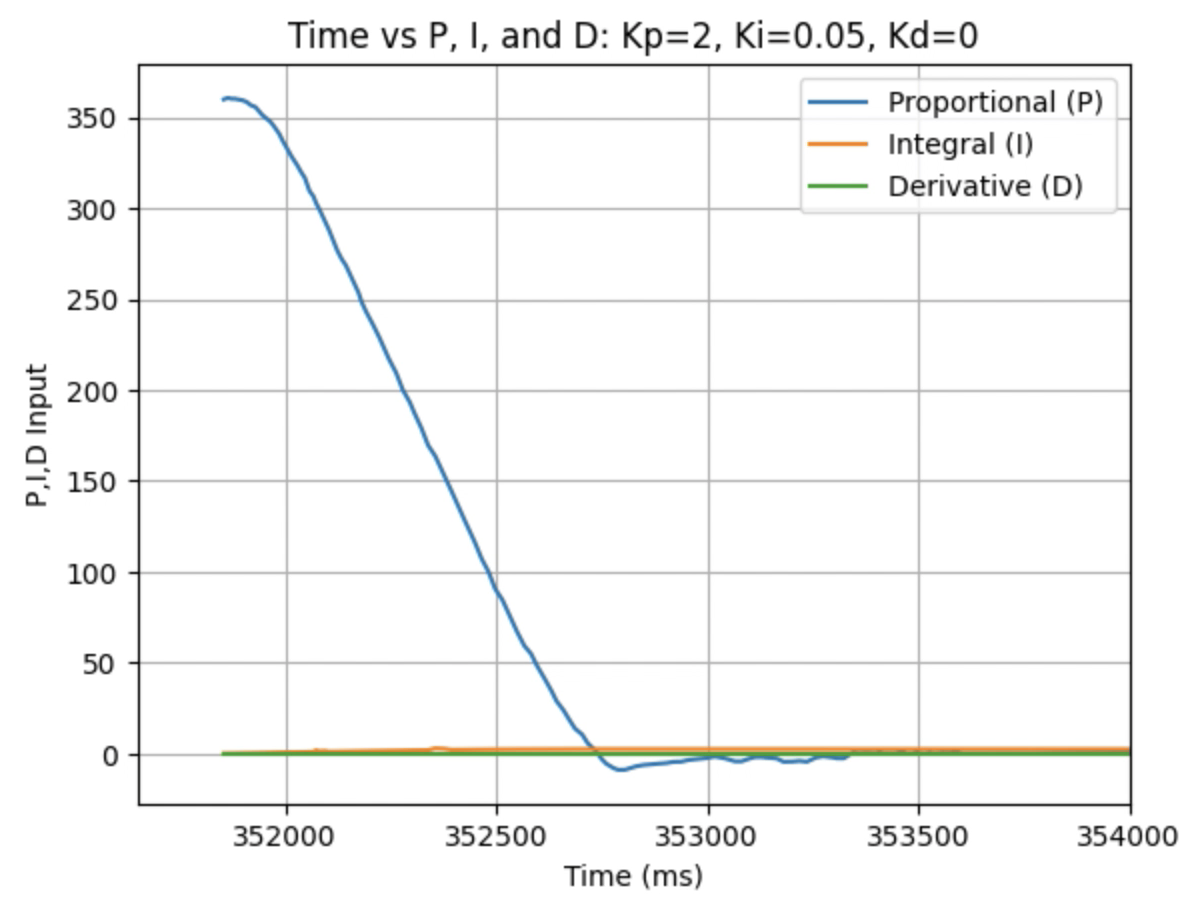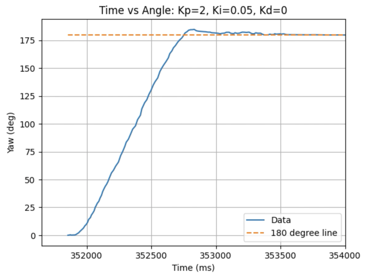 Trends that can be observed include, as the value for Ki increases the amount of oscillation and overshoot of the robot at the desired angle increases. The motor input for all tested values starts at the maximum of 255 before decreasing to a value of 120 before reaching the desired angle. For a value of Ki = 0.01 there is minimal overshoot and oscillation and a value of Ki = 0.05 also results in minimal overshoot but slightly more oscillation. For Ki = 0.1 there is more oscillation before reaching the desired angle and for Ki = 0.2 the oscillation continues for a longer amount of time. I choose a value of Ki = 0.05 to move on to testing the proportional, integral, and derivative controllers together.