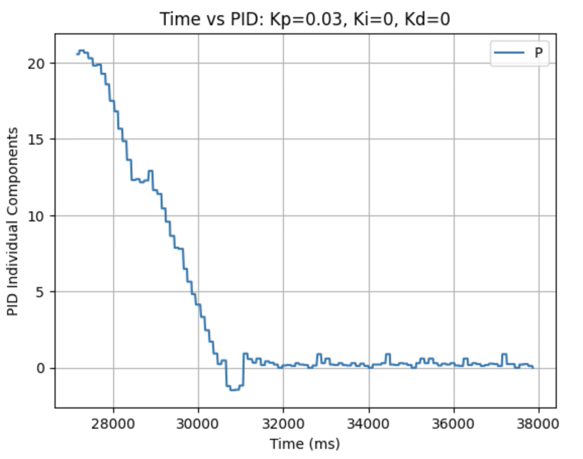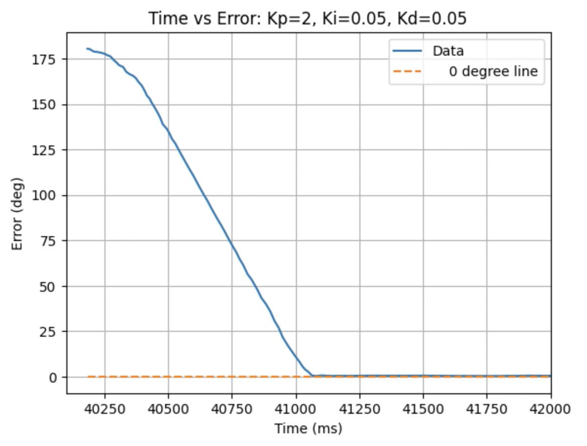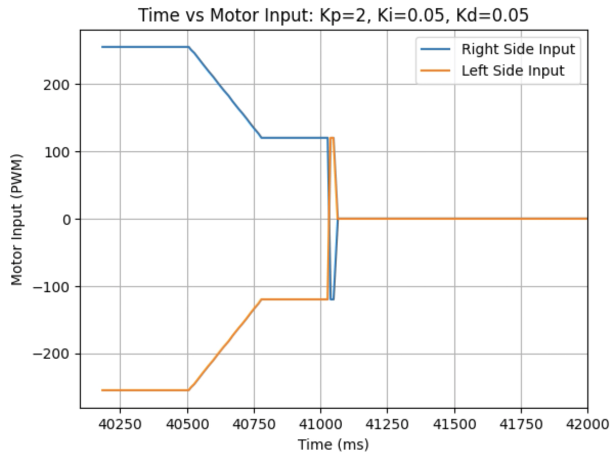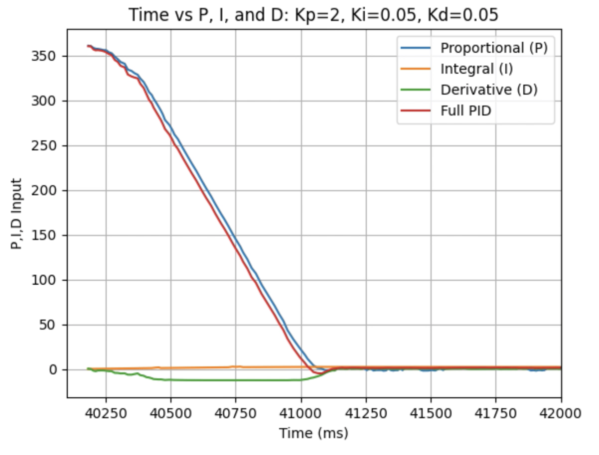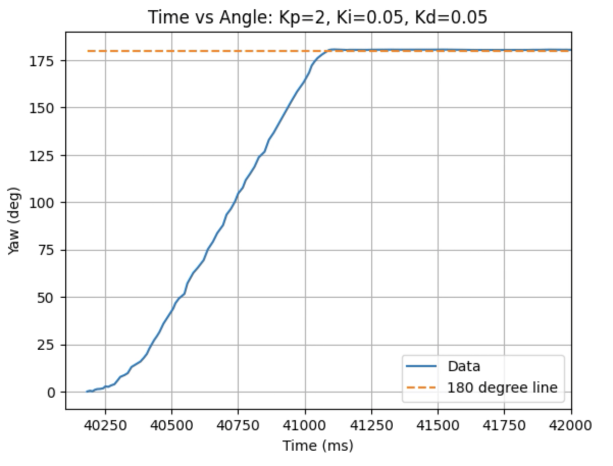 Trends that can be observed include, as the value for Ki increases the amount of oscillation and overshoot of the robot at the desired angle increases. The motor input for all tested values starts at the maximum of 255 before decreasing to a value of 120 before reaching the desired angle. For a value of Ki = 0.01 there is minimal overshoot and oscillation and a value of Ki = 0.05 also results in minimal overshoot but slightly more oscillation. For Ki = 0.1 there is more oscillation before reaching the desired angle and for Ki = 0.2 the oscillation continues for a longer amount of time. I choose a value of Ki = 0.05 to move on to testing the proportional, integral, and derivative controllers together.