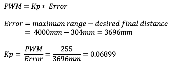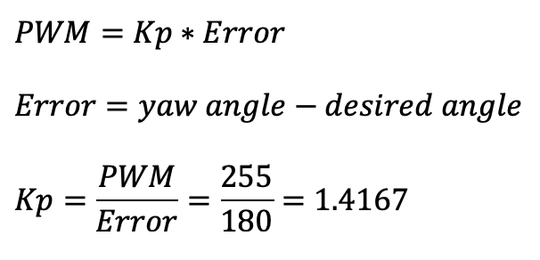 I started with testing the proportional controller. I worked on finding a value for Kp, while keeping Ki and Kd zero. I choose an angle of 180 degrees to start testing the proportional controller. I estimated the Kp constant to be 1.4167 when testing 180 degrees. The equations are found below: