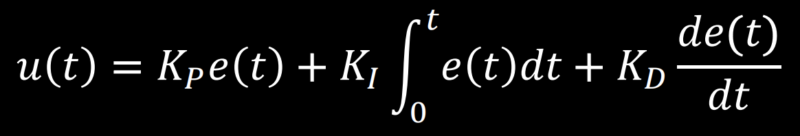 This equation uses the error e(t) (difference between the final desired value and the current value) in proportional, integral, and derivative control to calculate the new PID input value u(t). For this lab the error is the difference between the desired angle (yaw) and the robots current angle (yaw). The calculated PID input value is related to the robots angular speed. Proportional control multiplies a constant Kp by the error. Integral control multiplies a constant Ki by by the integral of the error over time. Derivative control multiplies a constant Kd by the rate of change of the error.