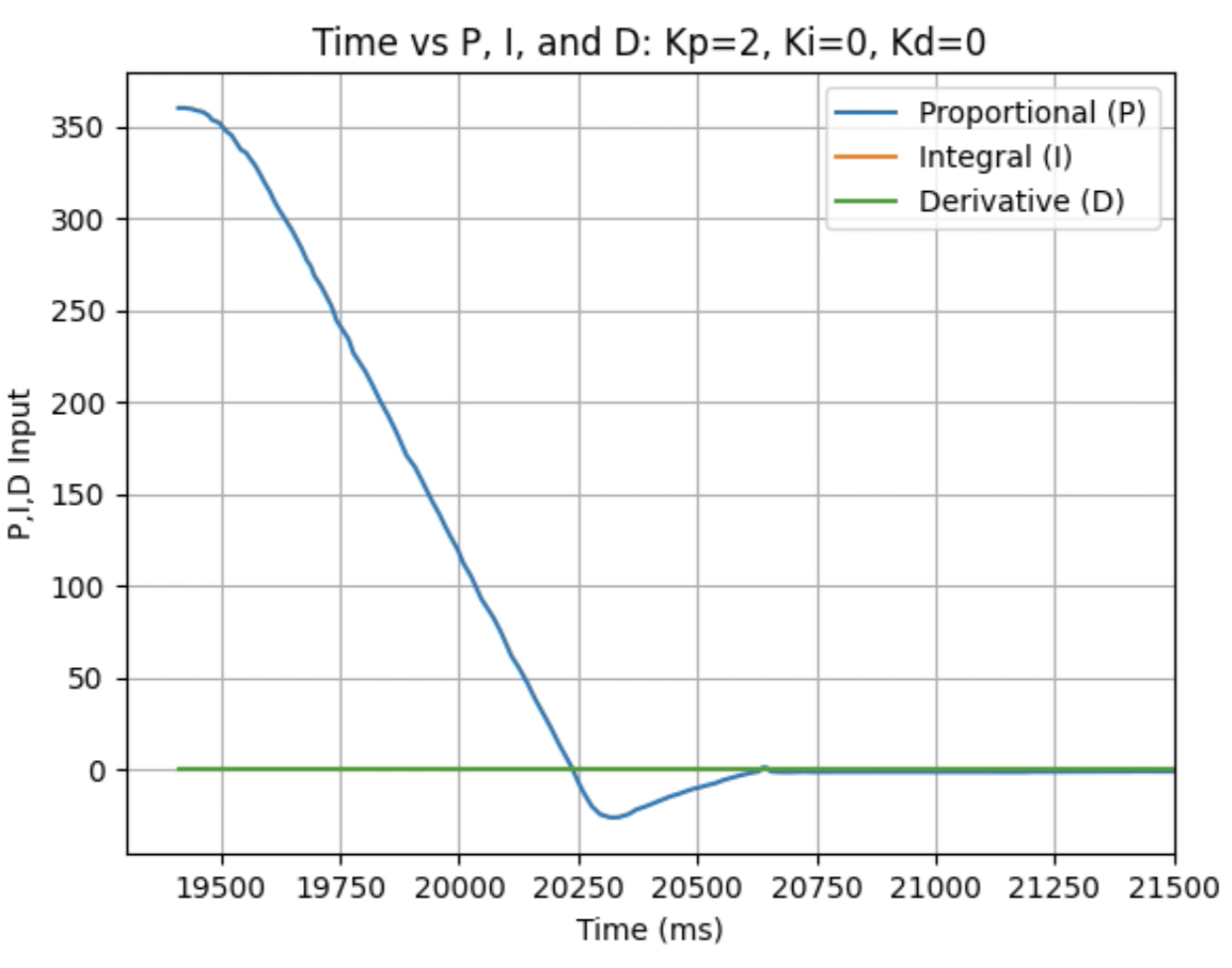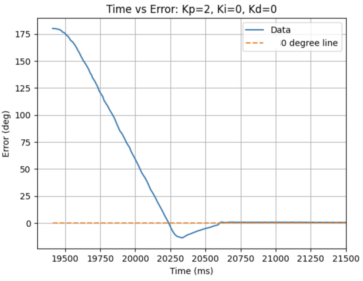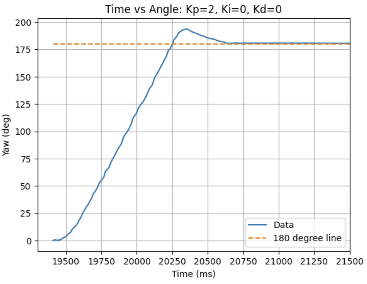 During physical testing I wanted the proportional control to slightly over shoot the desired angle. The over shoot will be addressed using derivative control and the speed will be addressed using integral control. A range of Kp values including 1, 1.5, 1.75, and 2 were tested as can be seen in the below graphs showing yaw, error, PID components, and motor input. I determined that the Kp value should be 2. The code for the proportional controller is below: