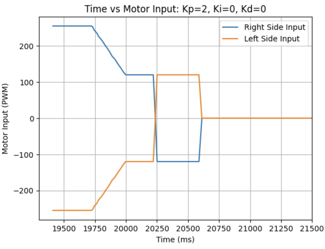 Trends that can be observed include, as the value for Kp increases the amount of time the robot takes to reach the desired angle decreases, but there is also more overshoot observed. As the value of Kp increases the motor input spends less time at the lower limit value of 120. For example, it is noticeably observed that for Kp = 1 the motor quickly reach the input value of 120 and remains at that value until the desired angle is reached. For Kp = 2 the motors start at the upper bound of 255 and then decrease to the lower limit of 120 before reaching 180 degrees. I choose a value of Kp = 2 to then move to testing the proportional and integral controllers together.