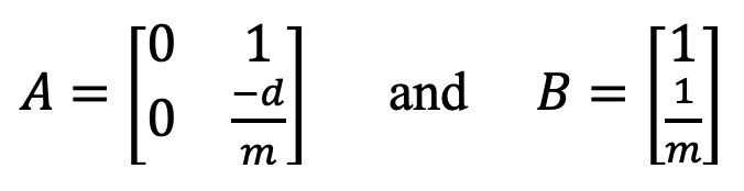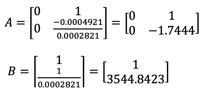 The A and B matrices were computed using the calculated values for d and m. From the state space equation the A and B matrices are: