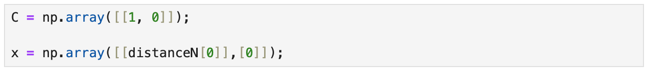 The C matrix for the state space is C = [1 0]. C is an m x n matrix where m is the number of states measured (1, ToF sensor distance) and n is the dimensions of the state space (2, ToF distance and velocity). The initial state is the first distance measurement and a velocity of 0 as the robot is not yet moving. The positive distance from the wall was measured.