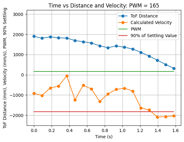 The step response u(t) was chosen to be a PWM value of 165. The step response is 64.71% of the maximum u PWM value of 255. I choose a PWM value of 165 as it was the fastest the robot could move while still moving straight for a distance of around 6.5ft. I collected time, ToF distance readings, and used these readings to calculated the velocity. To ensure that the step time was long enough for the robot to reach steady state, I ran the test multiple times.