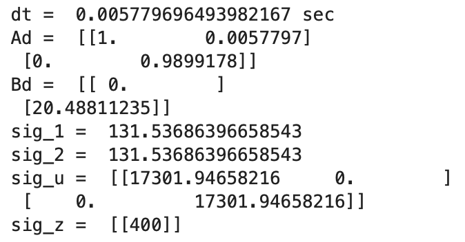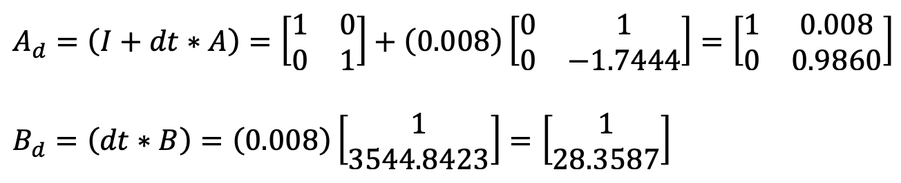 Initially, the sampling time for the discritized Ad and Bd matrices was calculated by subtracting the first time stamp from the second time stamp. After looking closely at the data, the sampling time between each time step was slightly different. I changed the calculation for Delta_T to be an average of all of the sampling time differences. The Delta_T was recalculated for each new dataset that I graphed. Below is an example calculation of the discritized Ad and Bd matrices, using the found sampling time of 0.008s for the PID loop in Lab 5. This dt is how fast the PID control loop is running.