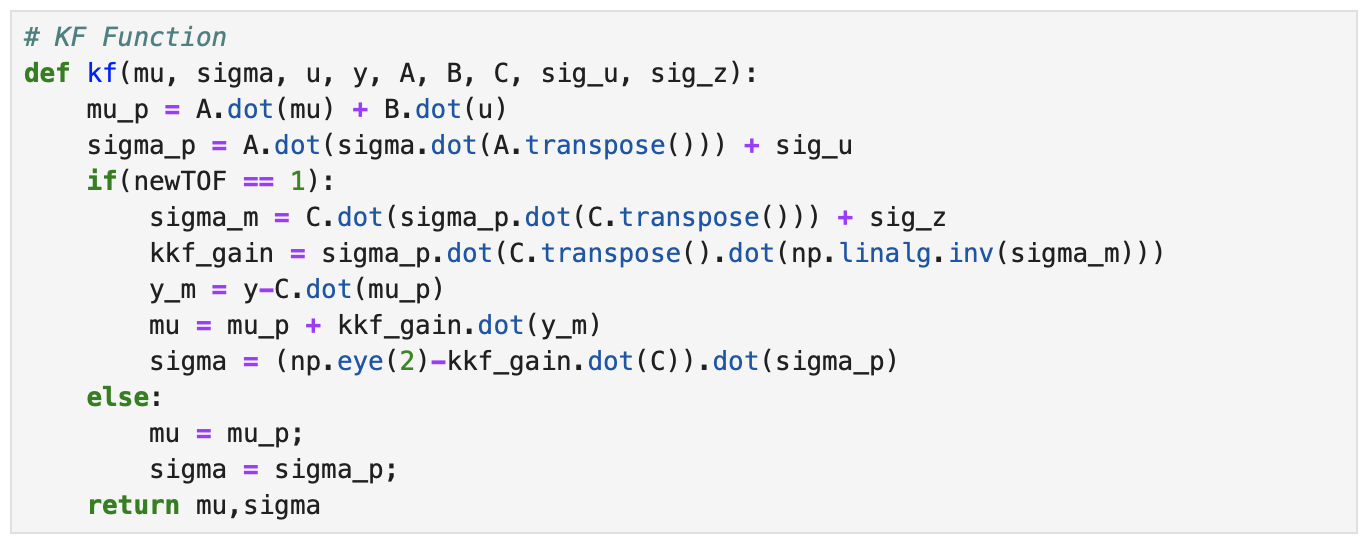 The below code for the Kalman Filter function was provided in the lab instructions and implemented in Jupyter Notebook.