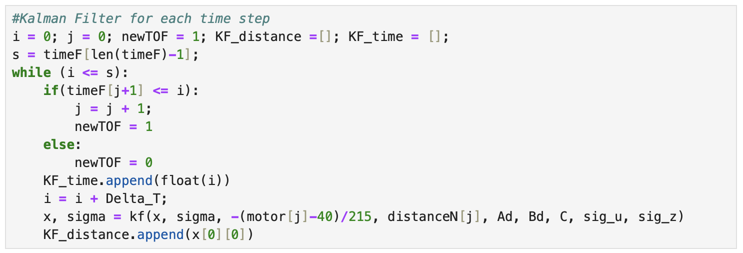 The while loop determines how many times the Kalman Filter runs. How many times the while loop runs depends on the the second to last time step for a ToF sensor reading and the value of Delta_T. If the value of the ToF time array is less than or equal to the value of the index, i, then the value of newTOF will be set to 1 and the update step of the Kalman Filter will run. If the value of the ToF time array is not less than or equal to the value of the index, i, then the value of newTOF will be set to 0 and only the prediction step of the Kalman Filter will run. The index i is updated by adding Delta_T each time the while loop runs and the value of i is appended to the array KF_time to plot the Kalman Filter. After i is updated, the Kalman Filter function is called and then the output distance (x) is appended to the KF_distance array to later be plotted. The u input was the negative value of 40 subtracted from the motor array storing PWM values, divided by 215 (the upper bound of 255 minus the lower limit of 40). The lower limit PWM value is 40. In this model if the motor input value is 40 then the value for u is zero (-(40-40)/215).