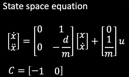 The state space model is used to find the A, B, and C matrices. The state space model for the robot from Lecture 13 is below. The model uses drag (d) and momentum (m) to form the A and B matrices. The two states are the location of the robot and the robots velocity.